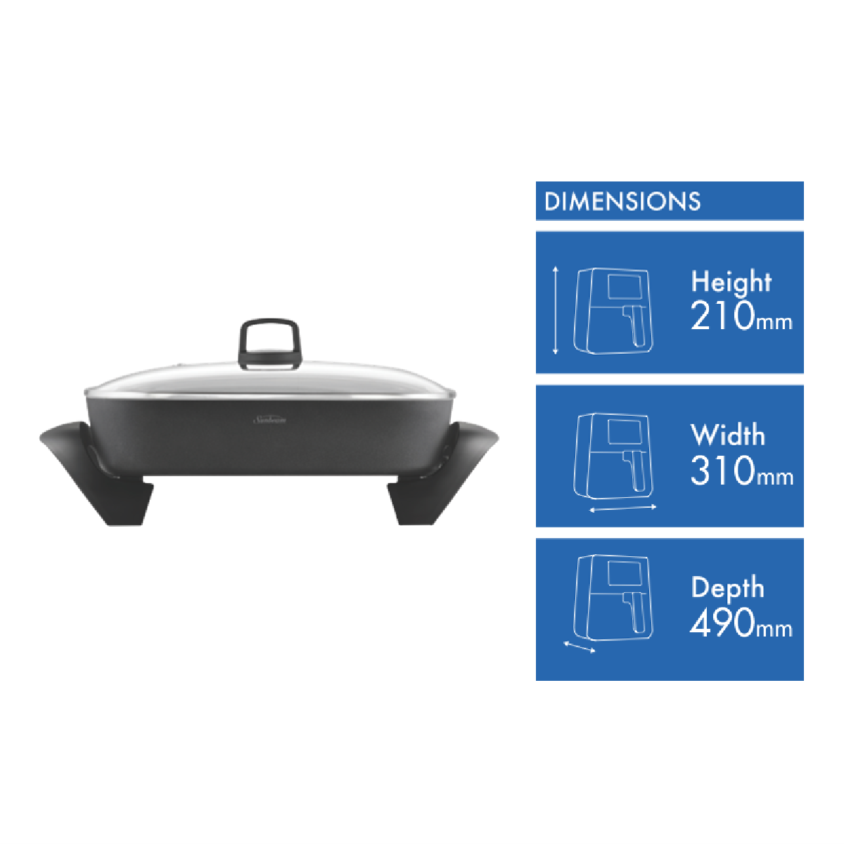Sizzle up a storm in the kitchen with the Sunbeam Banquet Frypan Diamond Force. This electric frypan features an innovative diamond-infused two layer non-stick coating for superior durability and easy food release when cooking with sticky sauces. The 310mm width and 210mm height offers ample cooking space while the glass lid allows you to keep an eye on things without losing heat or moisture. With a diamond-infused coating that is 2x more durable than traditional non-stick this frypan allows you to cook all your family favorites without fear of scratches or damage to the surface. The superior non-stick means even the stickiest foods will glide off the pan with ease ensuring quick and easy cleanup. So take your frying game to the next level with the Sunbeam Banquet Frypan Diamond Force. The manufacturer's part number for this product is FPM4000DF. Add this diamond-infused electric frypan to your cart today for scrumptious non-stick cooking.