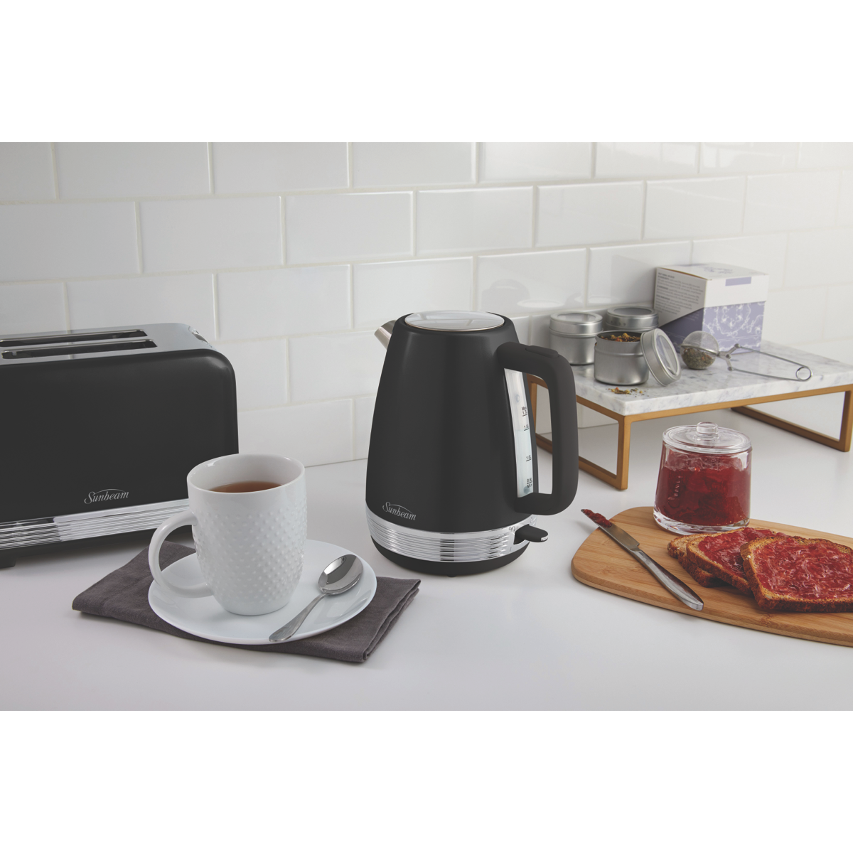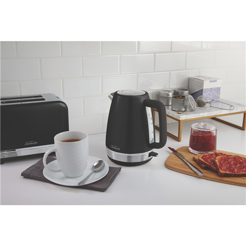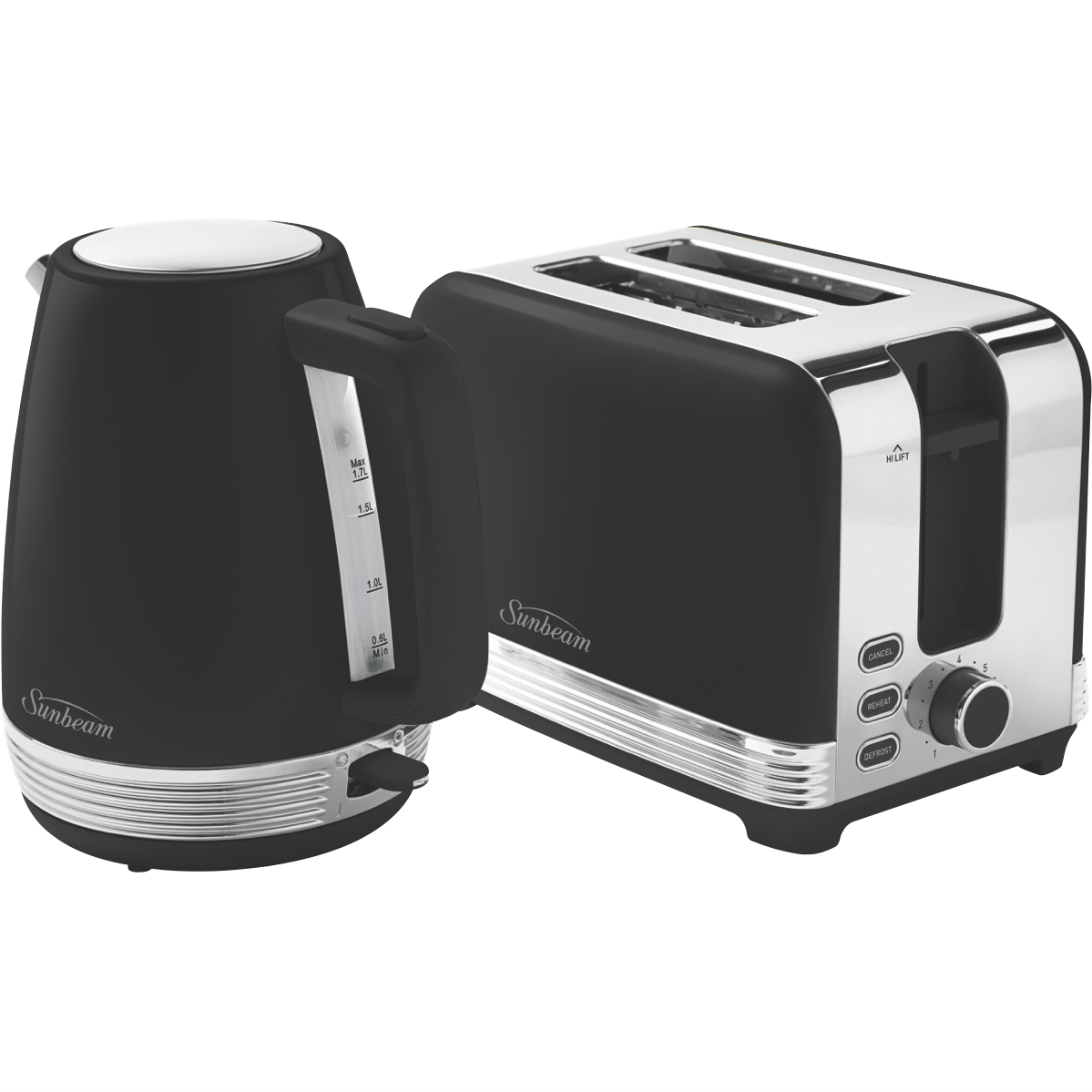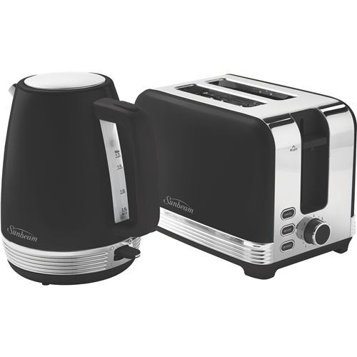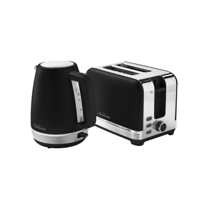 Bring a touch of elegance to your morning routine with the Sunbeam Chic Breakfast Pack in sleek black. This stylish duo includes a 2 slice toaster with 7 browning settings and a 1.7L kettle with 1850W rapid boil element giving you perfect toast and piping hot tea or coffee in minutes. The 360° rotational base allows cordless convenience while the large viewing window with blue illumination lets you monitor water levels. An anti-calc filter ensures pure tasting beverages every time. With variable browning control you can achieve anything from light golden brown to dark crisp toast. The high lift lever makes removing small slices easy and the removable crumb tray allows effortless cleaning. Prepare breakfast your way with this modern breakfast essential. The manufacturer's part number for this product is PUM3510BK. Make your mornings shine with the Sunbeam Chic Breakfast Pack today.