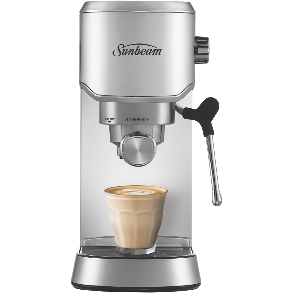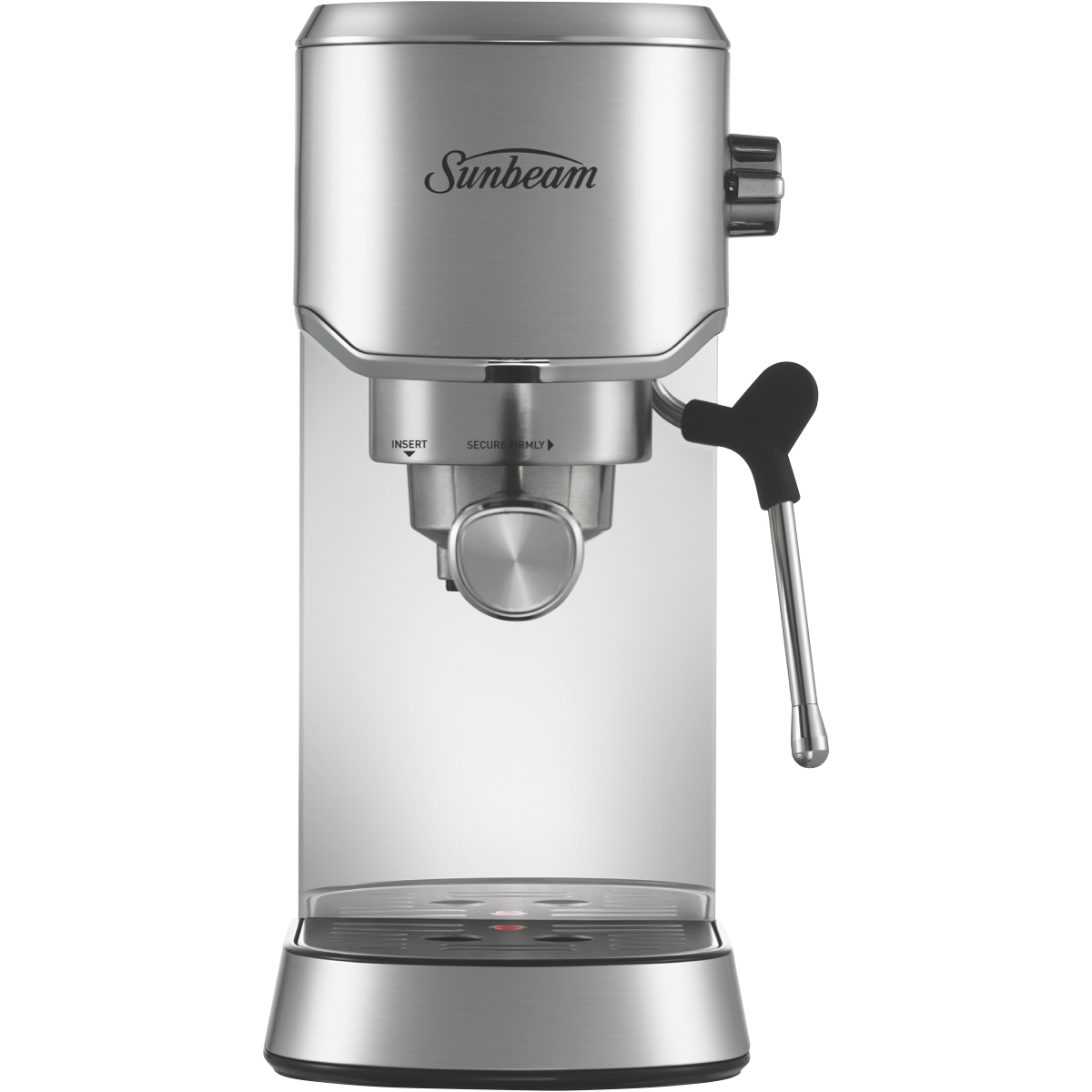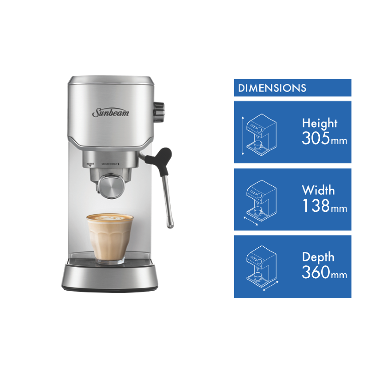 Savor barista-quality espresso at home with the Sunbeam Compact Barista Espresso Coffee Machine. This stainless steel manual coffee machine brews cafe-style coffee that will satisfy your inner barista. With a powerful 1250-1450 watt thermoblock heating system and 15 bar pump pressure it can extract rich full-flavored espresso from freshly ground beans. The 1 litre detachable water tank allows you to brew cup after cup without refilling. Froth milk with the built-in steam wand to create creamy cappuccinos and lattes. The cup warming tray keeps your mugs at the ideal temperature while you brew. This espresso machine includes single and double shot filter baskets tamper measuring spoon and milk jug - everything you need to pull consistently great shots. Programmable descaling alerts help maintain flavor and performance. Measuring just 305mm high 360mm deep and 138mm wide the Sunbeam Compact Barista Espresso Coffee Machine combines commercial-grade engineering with a compact footprint that fits perfectly on your kitchen benchtop. Craft barista-quality coffee drinks at home every day with this versatile manual espresso machine. The manufacturer's part number for this product is EMM2900SS. Discover the joy of being your own barista today.