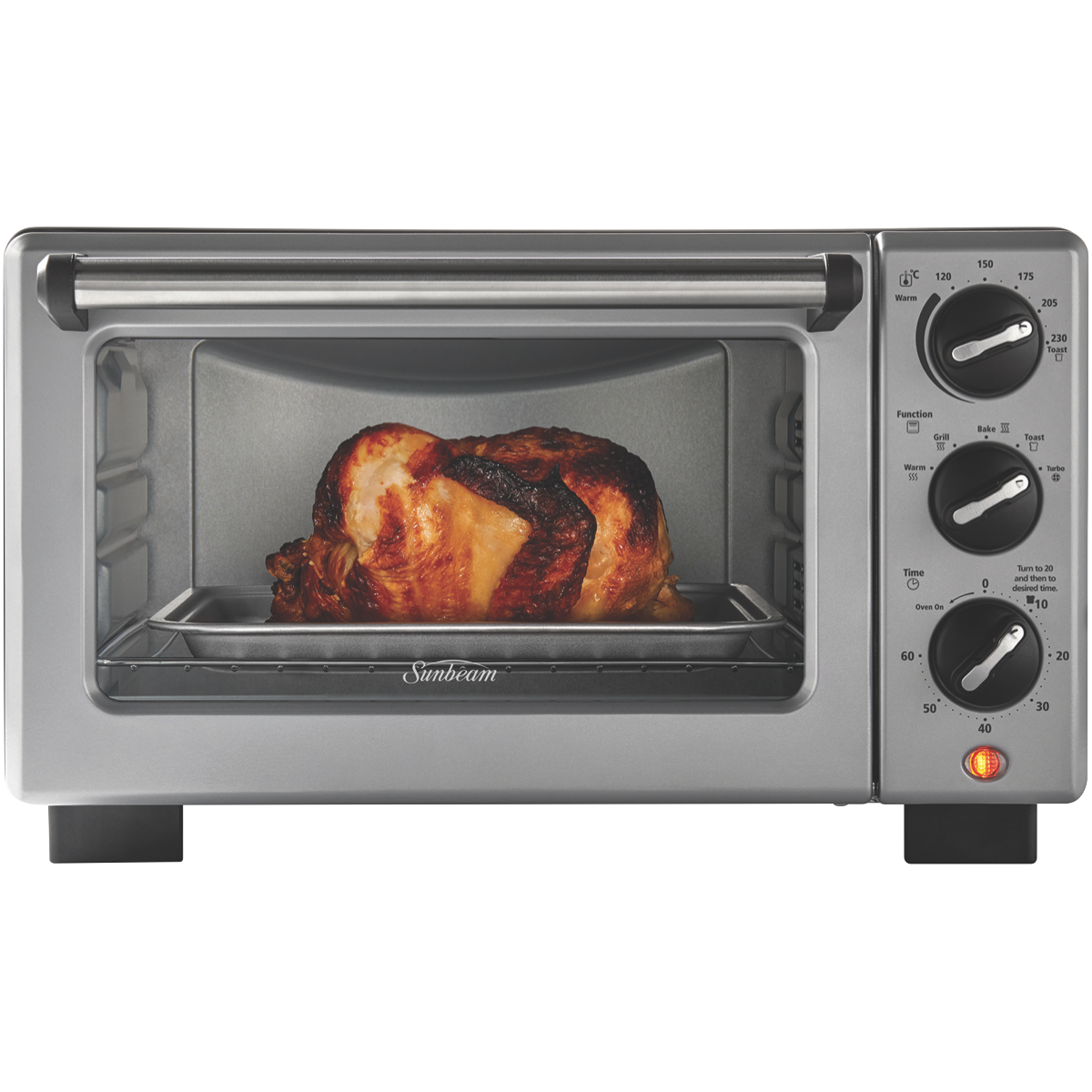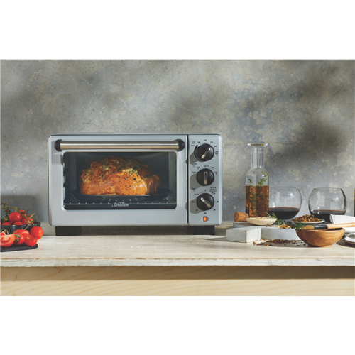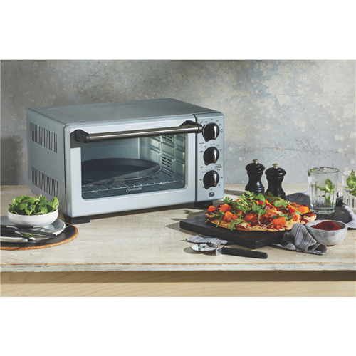 Bake grill and toast to perfection with the versatile Sunbeam Convection Bake & Grill Compact Oven. This metal-wrapped compact oven offers 18 litres of cooking space and 1400 watts of power to quickly and evenly prepare everything from pizza to roast chicken. Independent dial controls allow you to easily set the temperature cooking mode and 60-minute timer. Turbo convection technology circulates hot air for fast even cooking results. The adjustable wire rack and multiple accessories like the pizza tray and baking pan provide flexibility. Grill juicy burgers crisp up fries or bake cakes cookies and more. With settings for baking grilling warming and toasting this is the ideal countertop oven for small spaces. The manufacturer's part number for this product is COM3500SS. Discover how convenient cooking can be with the Sunbeam Convection Oven.