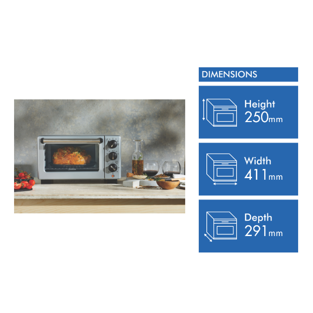 Additional Features Turbo Convection Heat technology for fast and even cooking, Fully adjustable temperature control up to 230C, Adjustable rack settings