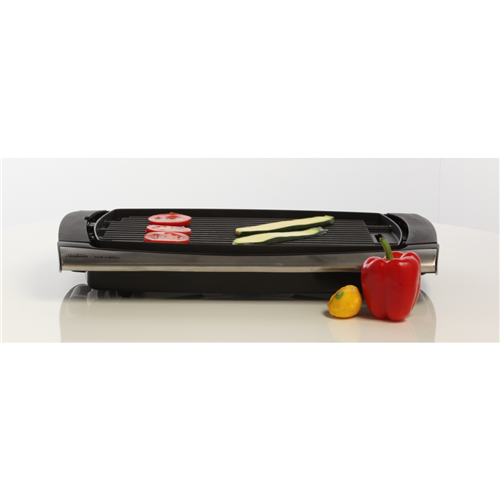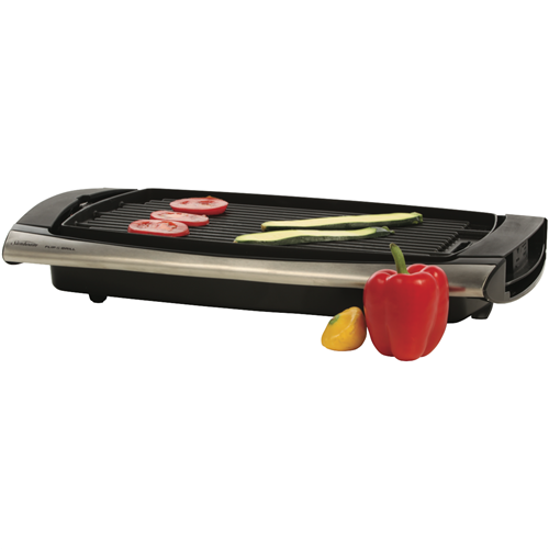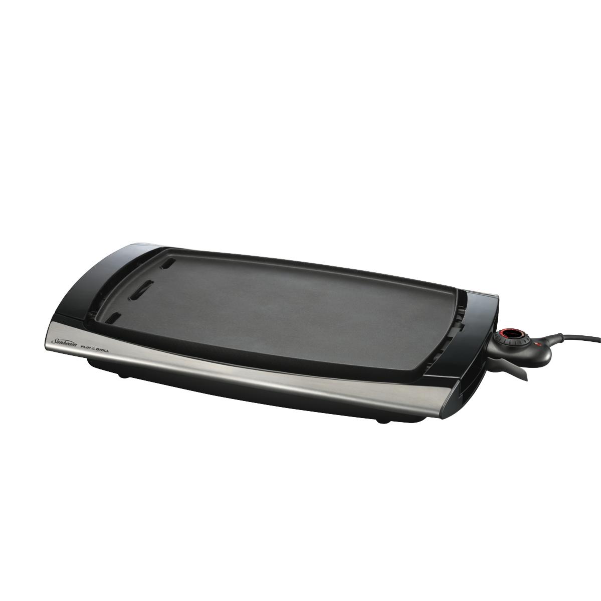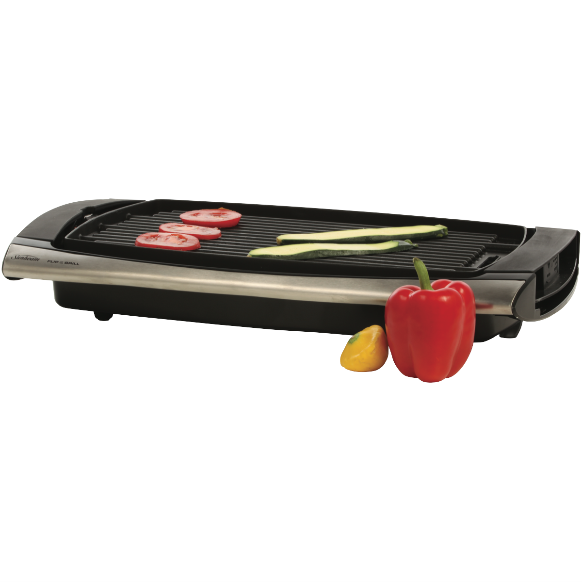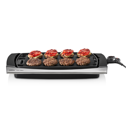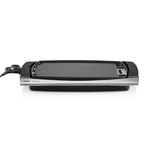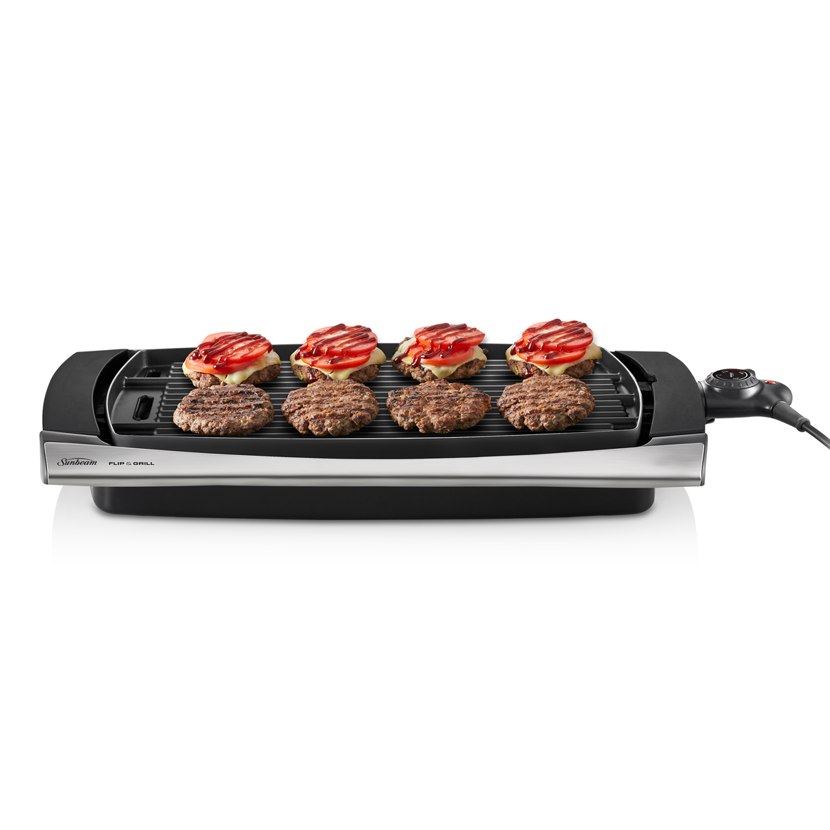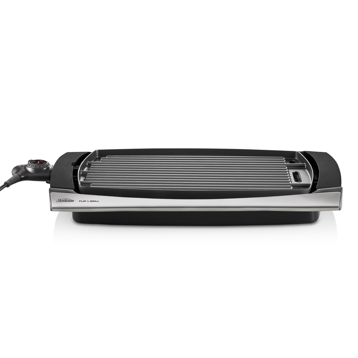 This Sunbeam indoor grill features a removable element an electrical thermostat and a black finish. You can make clean up after grilling quick and simple with help from this Sunbeam indoor grill.