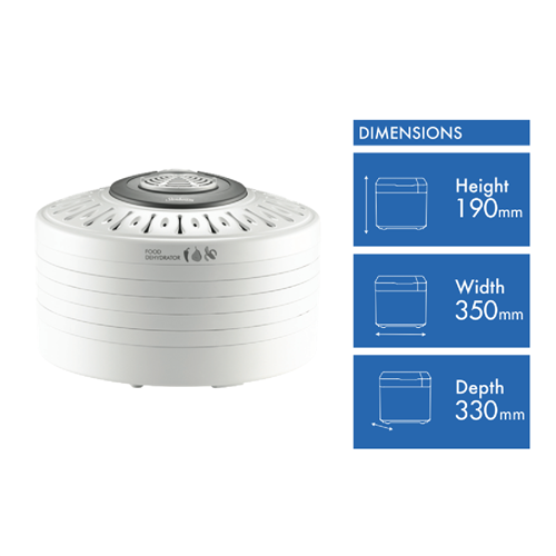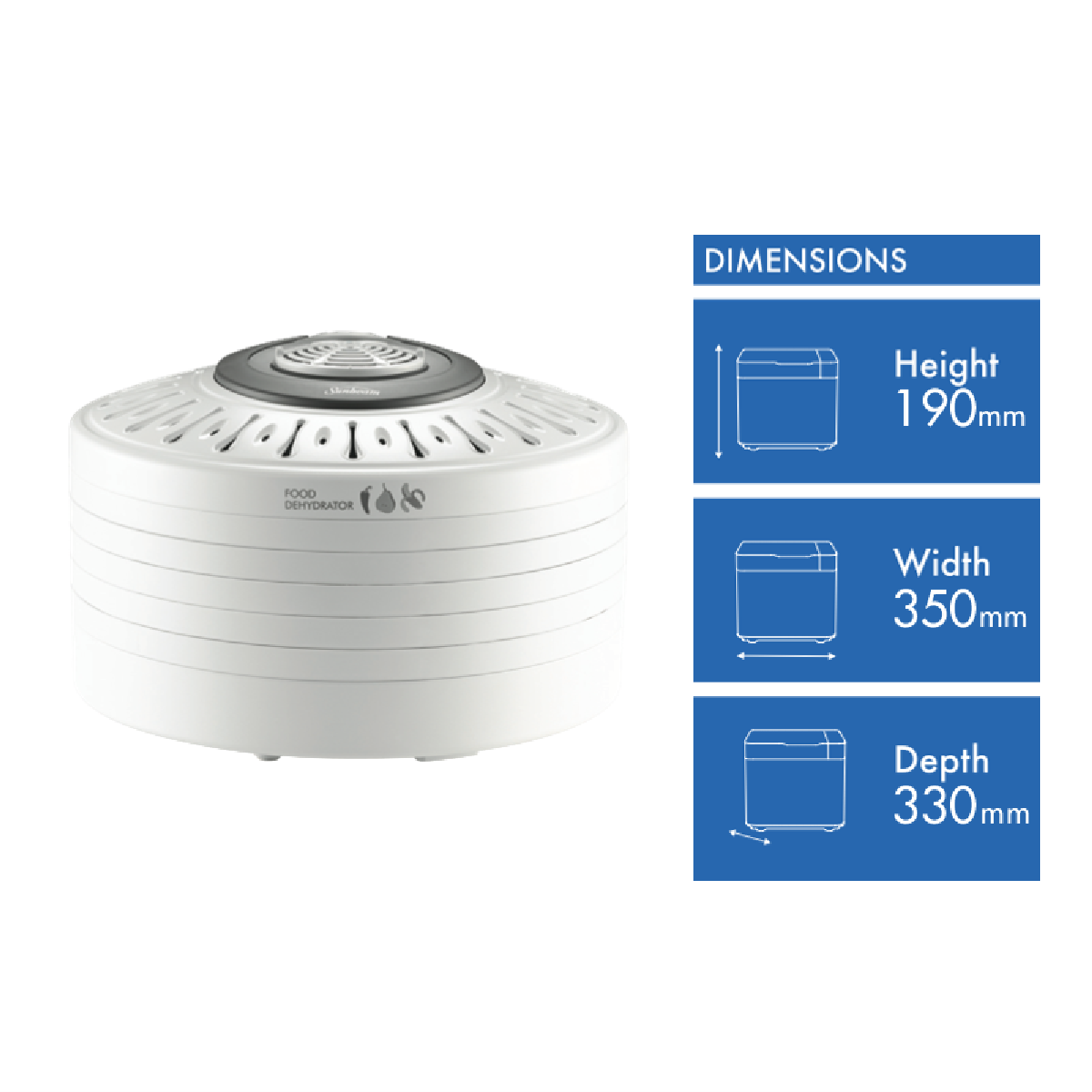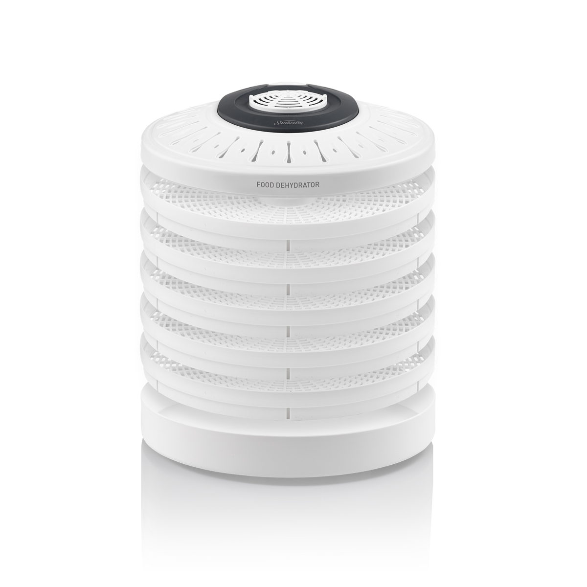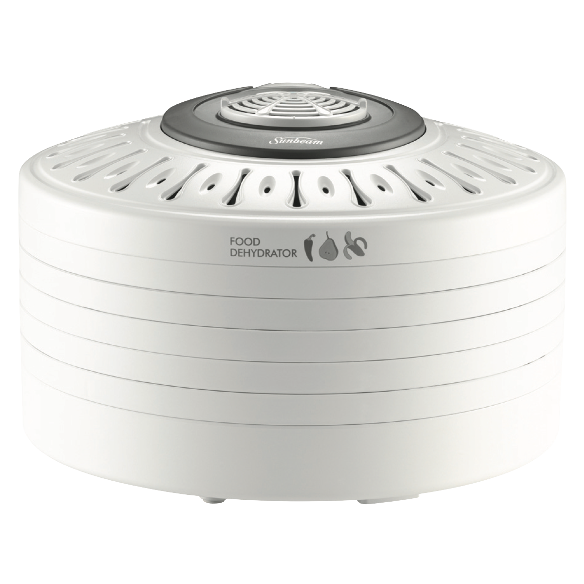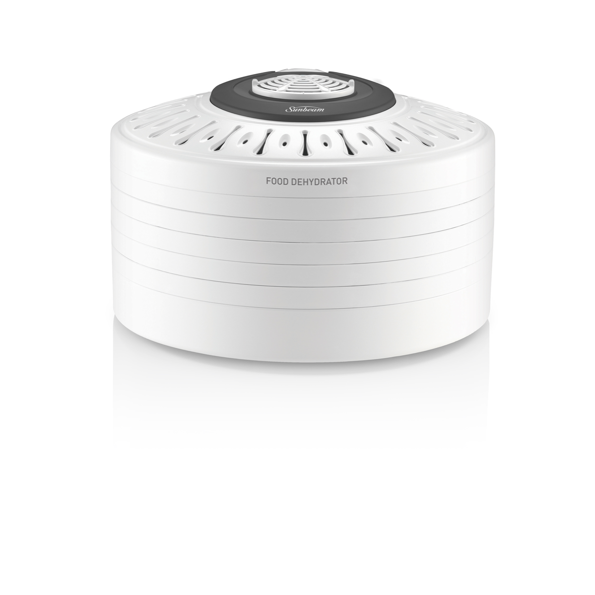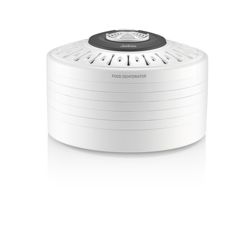 Transform your home cooking and unlock healthier living with the Sunbeam Food Dehydrator DT5600. This versatile kitchen appliance enables you to create delicious dried fruits vegetables jerky crackers breads herbs and more using its 3 adjustable heat settings and 5 spacious drying racks offering 370 watts of drying power. The included fruit roll tray accessory lets you make fruit leathers and roll-ups easily. Measuring 190mm H x 350mm W x 330mm D the Sunbeam Food Dehydrator boasts a contemporary streamlined design to complement any kitchen decor. Its adjustable thermostat ensures precise temperature control for optimal dehydration while the transparent door and internal light let you monitor the drying progress. The top-mounted fan circulates air evenly over all trays for fast efficient and consistent results you'll love. With 1 year warranty the Sunbeam DT5600 Food Dehydrator empowers you to make wholesome snacks and ingredients from the comfort of home. The manufacturer's part number for this product is DT5600.