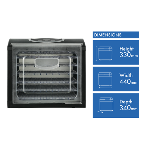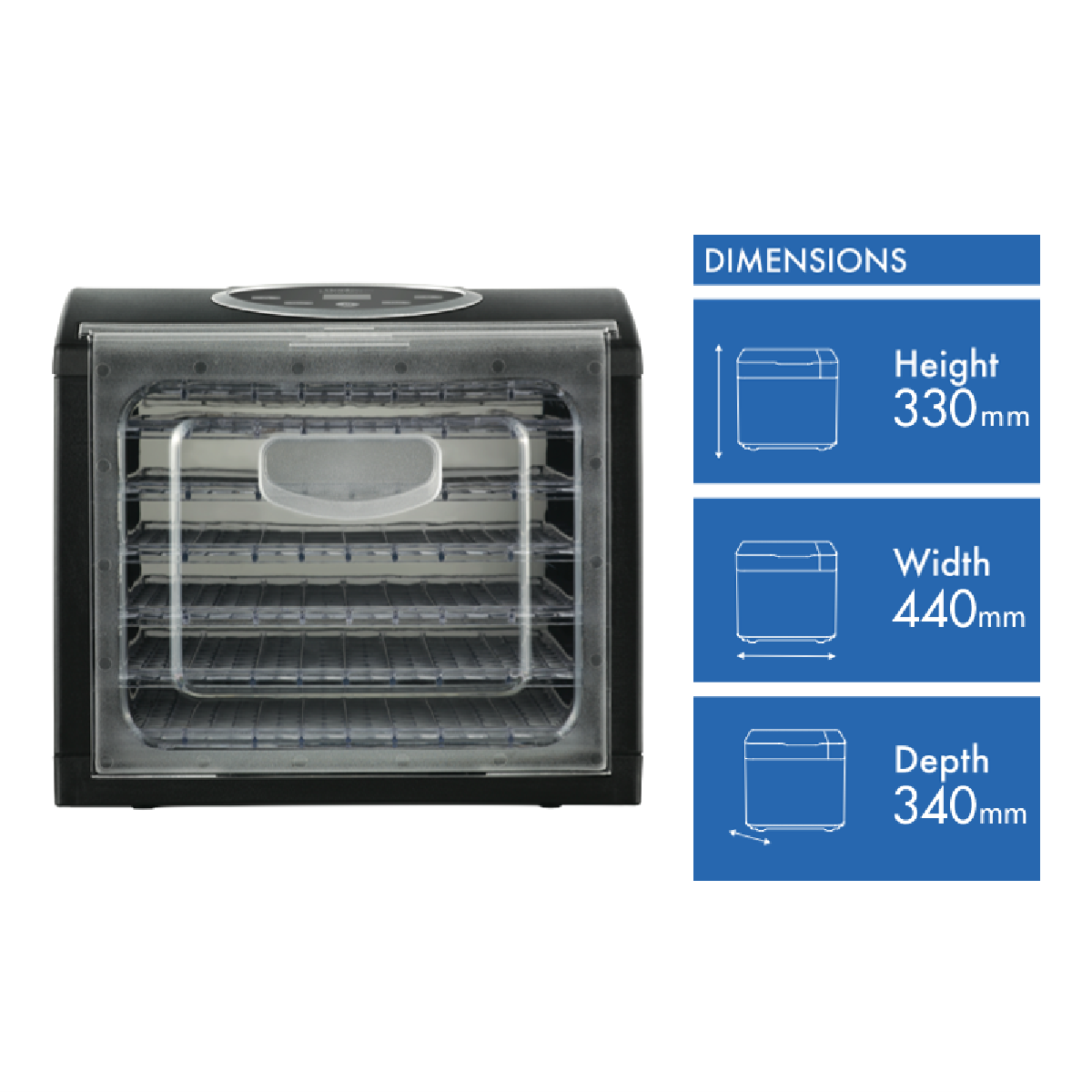 The Sunbeam Food Lab Electronic Dehydrator DT6000 makes home food dehydration effortless. With 500 watts of power this Australian designed dehydrator circulates warm air around your ingredients to remove moisture. The fine mesh tray ensures an even drying process while retaining nutrients and flavor. Measuring 330mm high x 440mm wide x 340mm deep the Food Lab fits neatly on your countertop. Dehydrate fruits vegetables jerky herbs and more without hassle. The Sunbeam warranty covers your purchase for 1 year. Rediscover the joy of creating tasty dried foods at home with the Food Lab. The manufacturer's part number for this product is DT6000. Take your culinary skills to new levels with this innovative appliance.