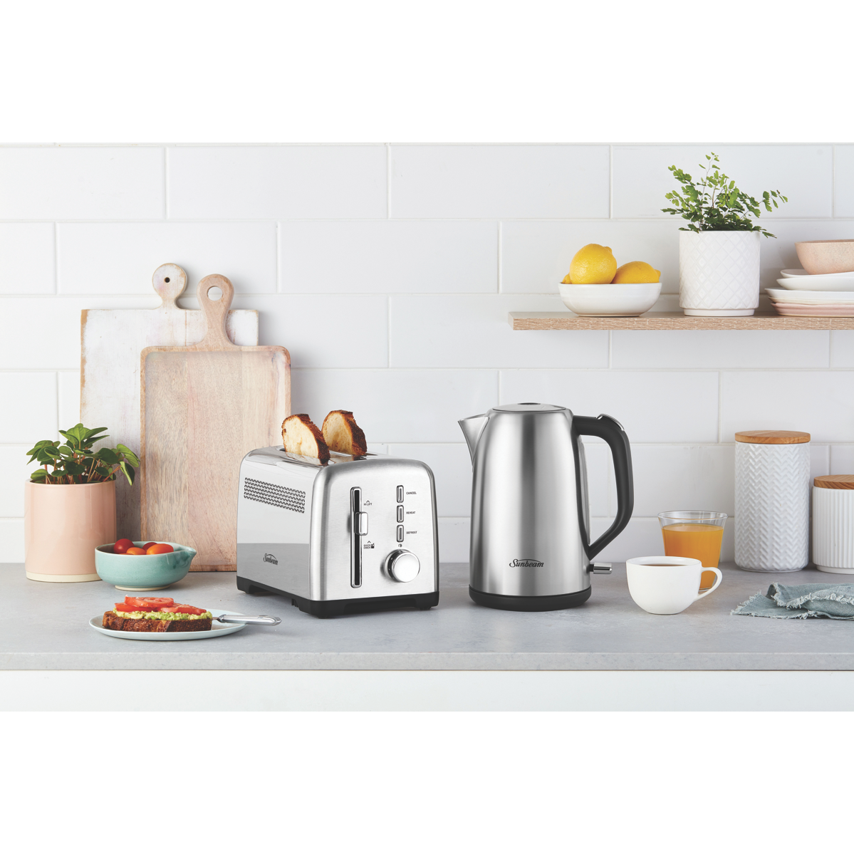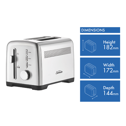 Discover the perfect toast every time with the Sunbeam Fresh Start 2 Slice Toaster. With 9 browning settings you can achieve any shade from light golden brown to dark crisp catering to all tastes. The high lift lever allows for safe removal of smaller items while the QuickCheck feature enables you to monitor browning progress without interrupting the cycle. With a sleek stainless steel exterior to complement any kitchen decor this toaster not only looks good but delivers consistent results. The two extra-wide slots accommodate a variety of bread types from thick artisan slices to bagels and crumpets. Whether it's crispy toast for breakfast or quick snacks this versatile Sunbeam toaster has you covered. Backed by a 12 month warranty this quality appliance is built to last. The manufacturer's part number for this product is TAM1002SS. Add this stylish and functional toaster to your cart today for delicious toasted treats anytime.