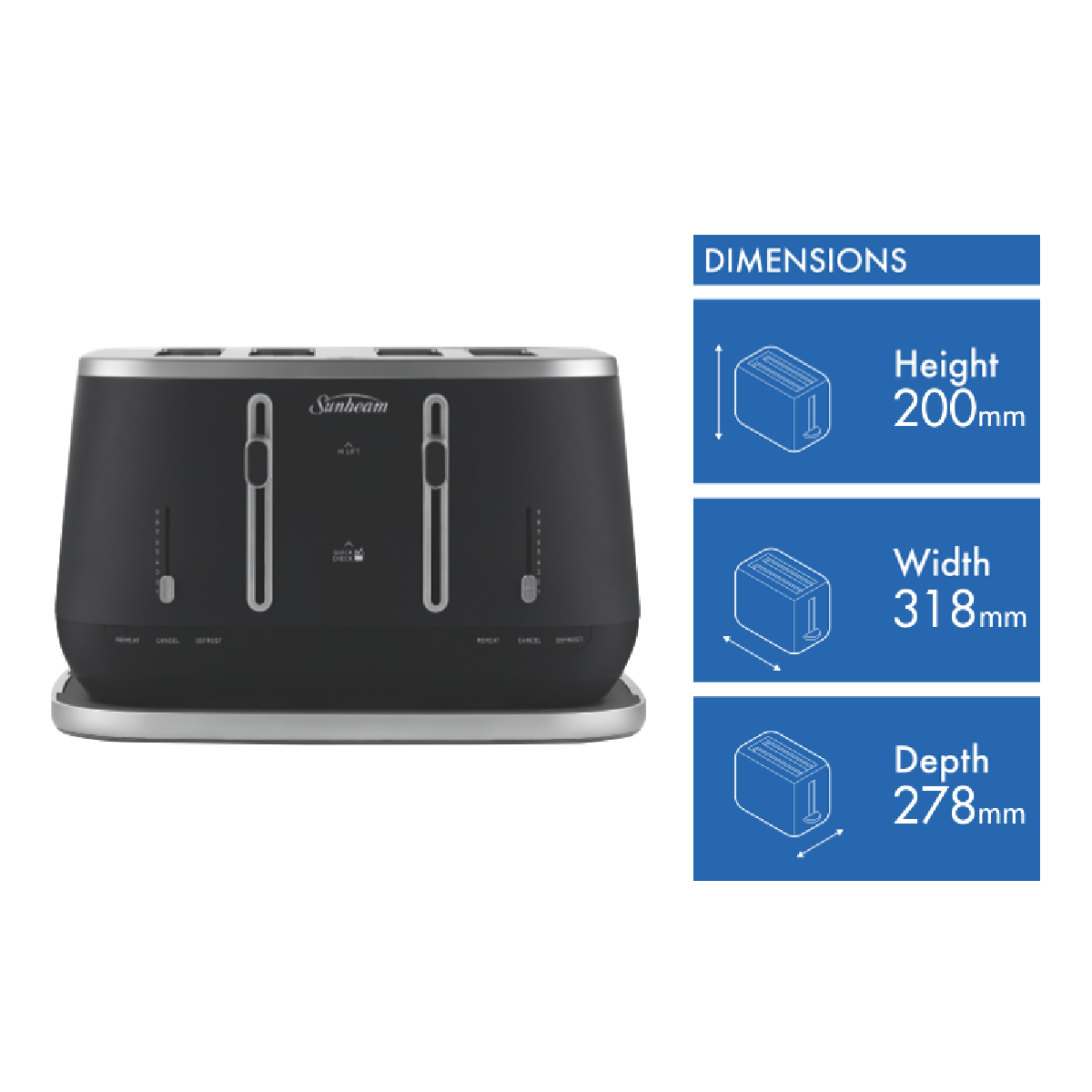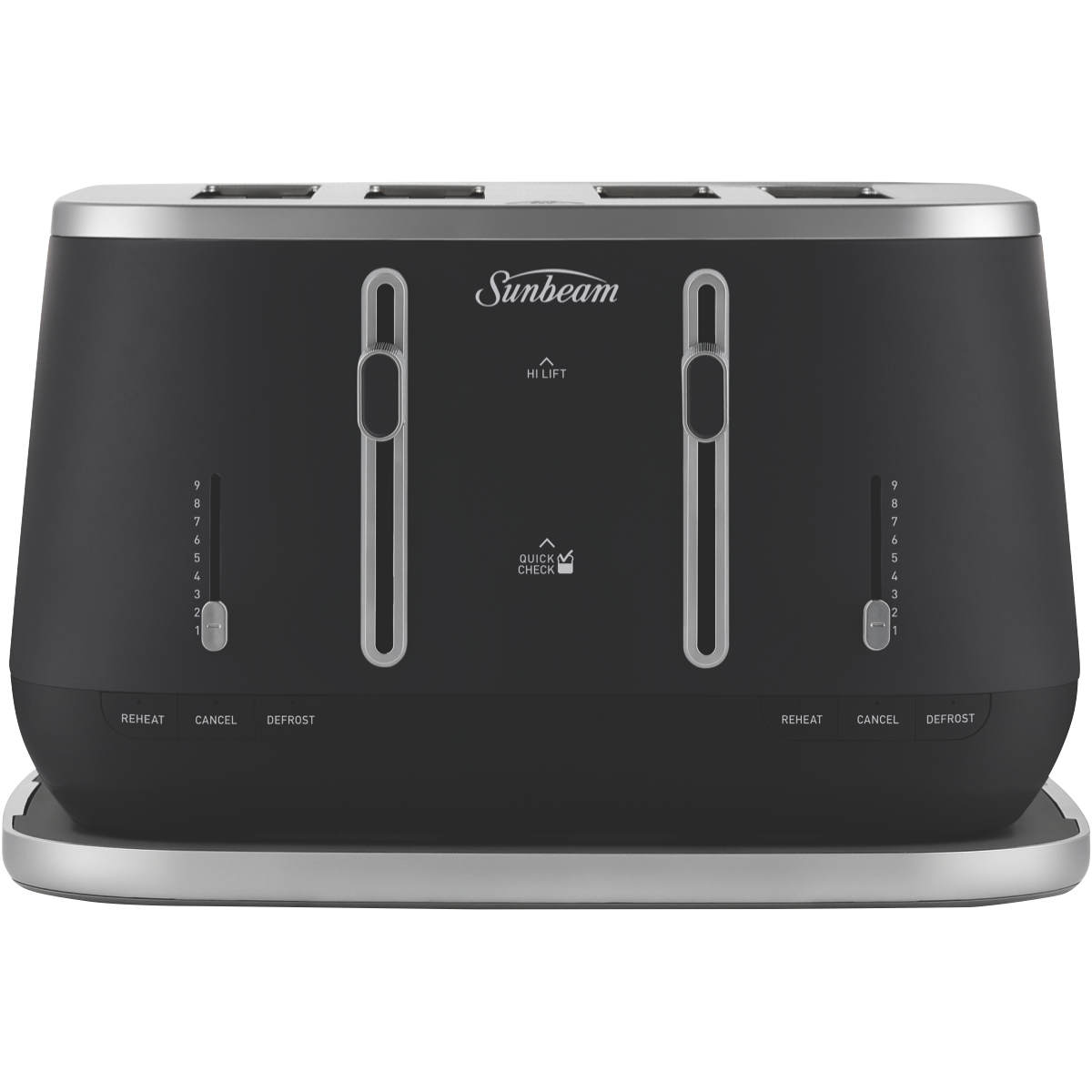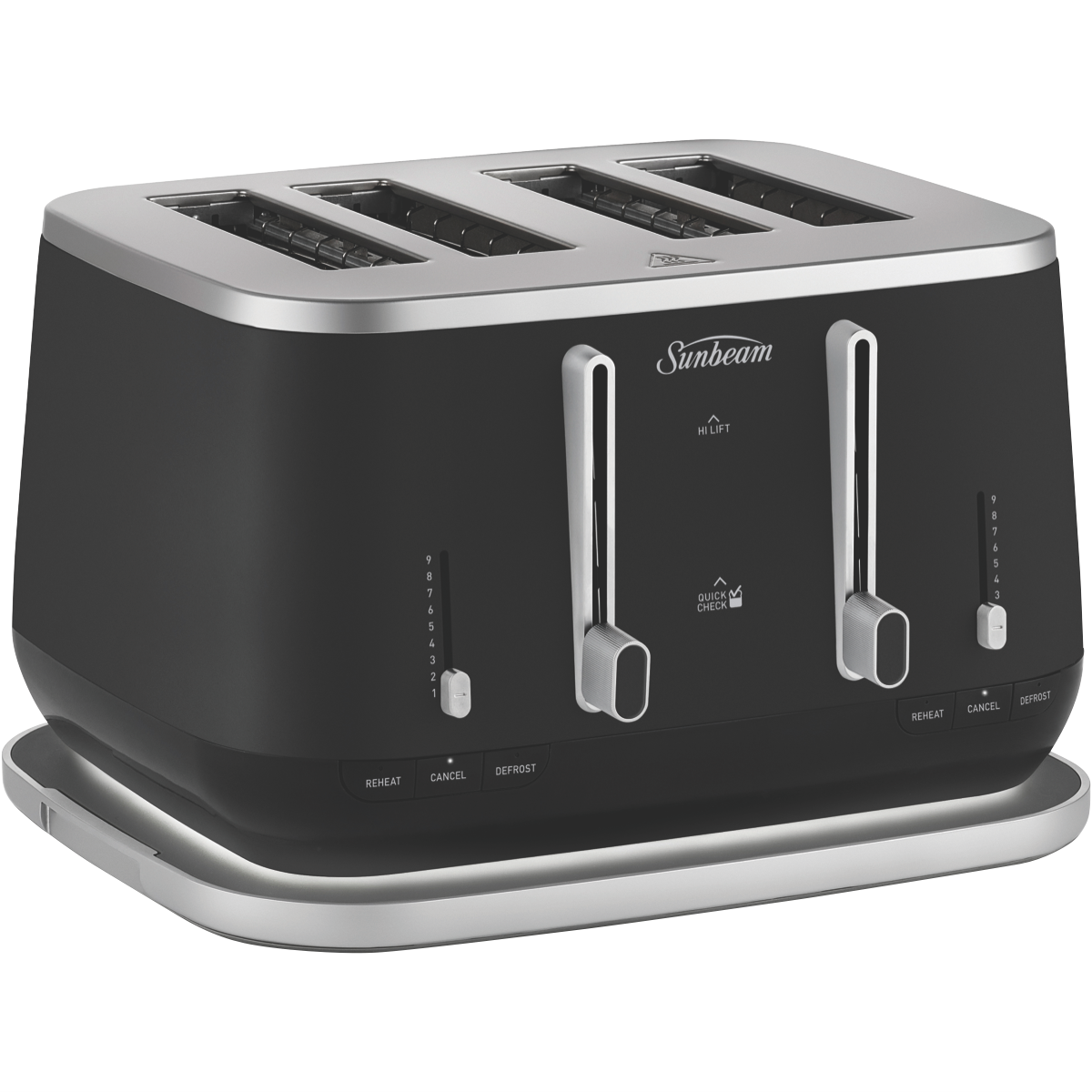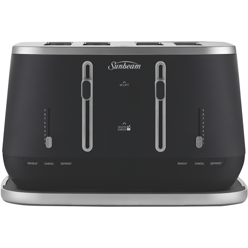 A sleek addition to any modern kitchen the Sunbeam Kyoto Collection Black 4 Slice Toaster brings contemporary style and essential functionality to your breakfast routine. With 1800 watts of power this 4-slice toaster can handle everything from a single slice to four slices at once ensuring the whole family can enjoy toast just the way they like it. The variable browning control and defrost function provide customized results while self-centering slots grip each slice perfectly. QuickCheck technology lets you monitor browning progress without interrupting the cycle and a high lift lever makes removing smaller pieces safe and easy. Finished in an elegant matte black this Sunbeam toaster features a removable crumb tray for effortless cleaning and cord storage to keep your countertop clutter-free. Designed for performance and durability with a 3-way safety system this 1800 watt 4-slice toaster delivers exceptional results every day. Add a touch of modern style and convenience to your kitchen with the Kyoto Collection Black 4 Slice Toaster. The manufacturer's part number for this product is TAM8004BK. Learn more about the outstanding features of this Sunbeam toaster today.