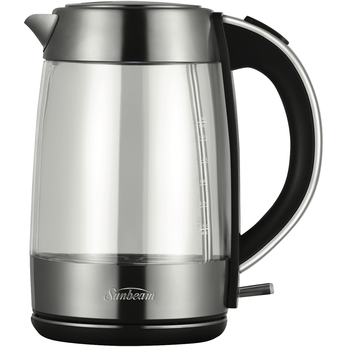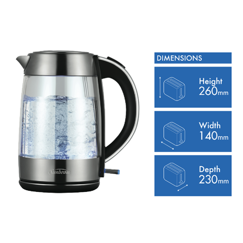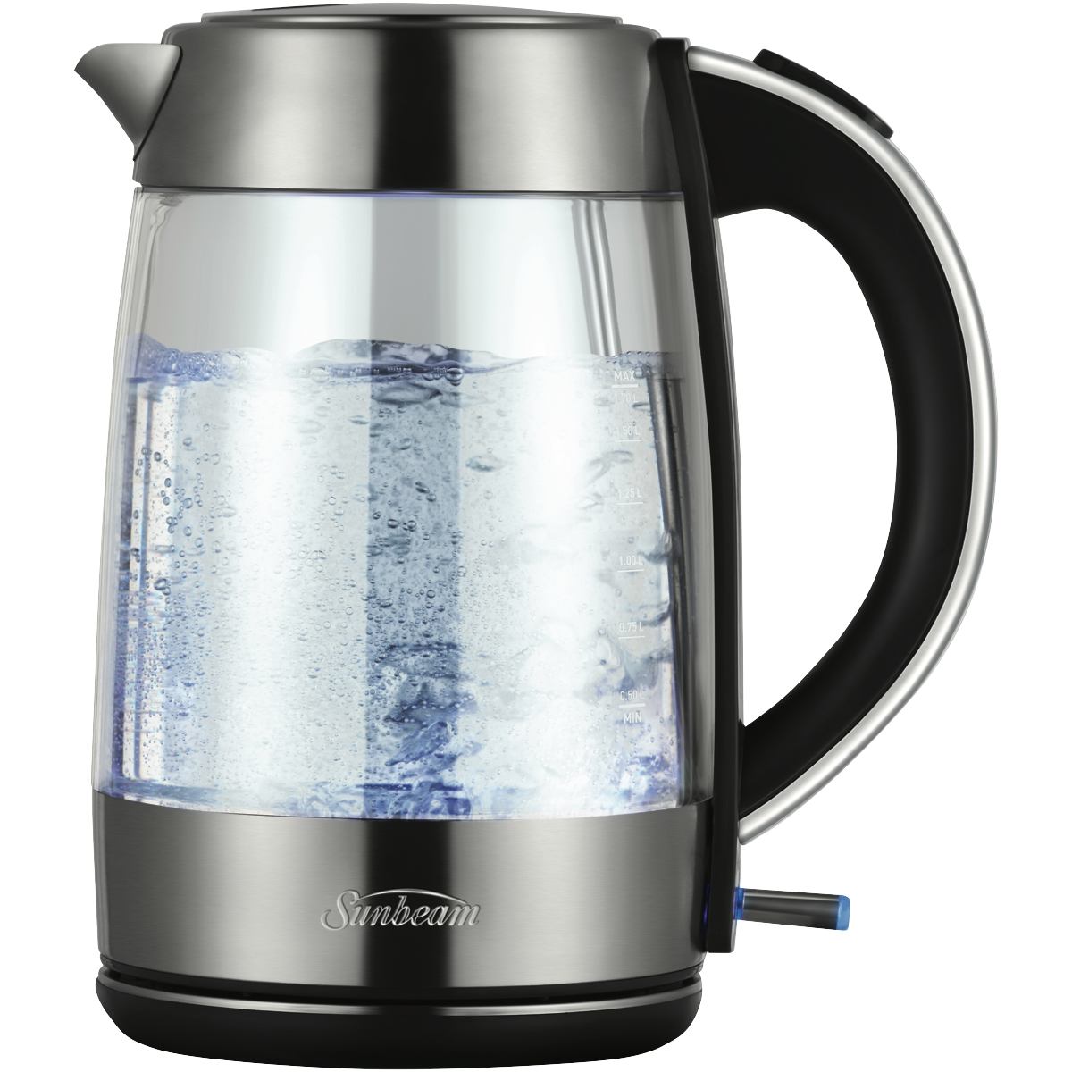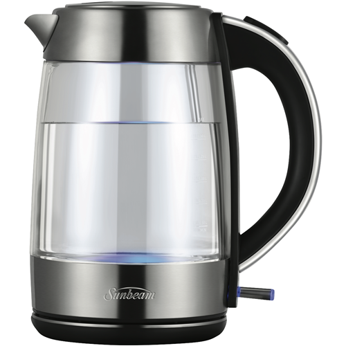 Discover a modern way to brew up a storm with the Sunbeam Maestro Glass Kettle. This stylish 1.7L kettle features a sleek glass design that allows you to monitor the boil. With a powerful 2400 watt element it rapidly heats water while the easy-fill push button lid provides convenient one-handed operation. Dual shield technology protects the hand grip from getting hot. The cool blue illumination at the base creates a beautiful glow to complement any kitchen. This kettle has a wide opening and visible water level window so you can easily fill it to the desired amount. Enjoy the convenience of cordless pouring and carry the kettle safely using the stay-cool handle. With a contemporary look and smart features the Sunbeam Maestro makes a great addition to your kitchen. The manufacturer's part number for this product is KE9750. Check out this modern electric kettle today for an easy way to boil water.