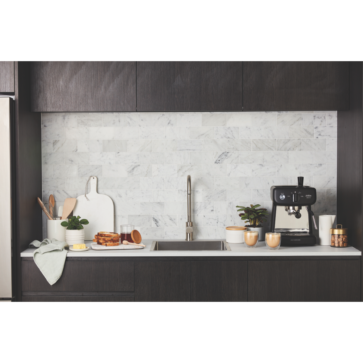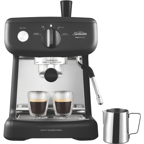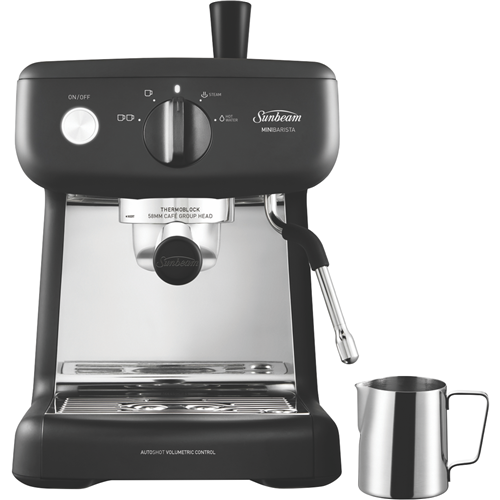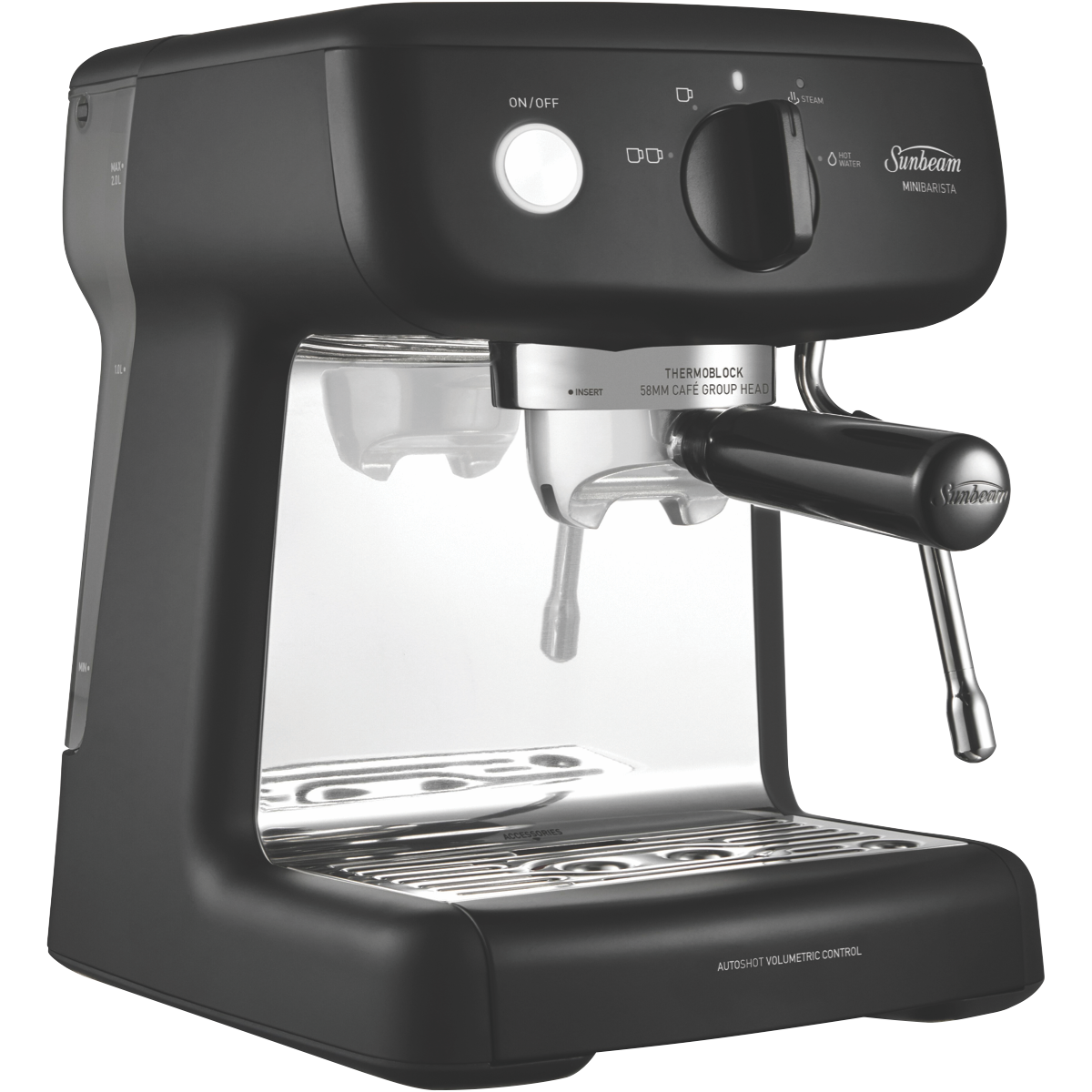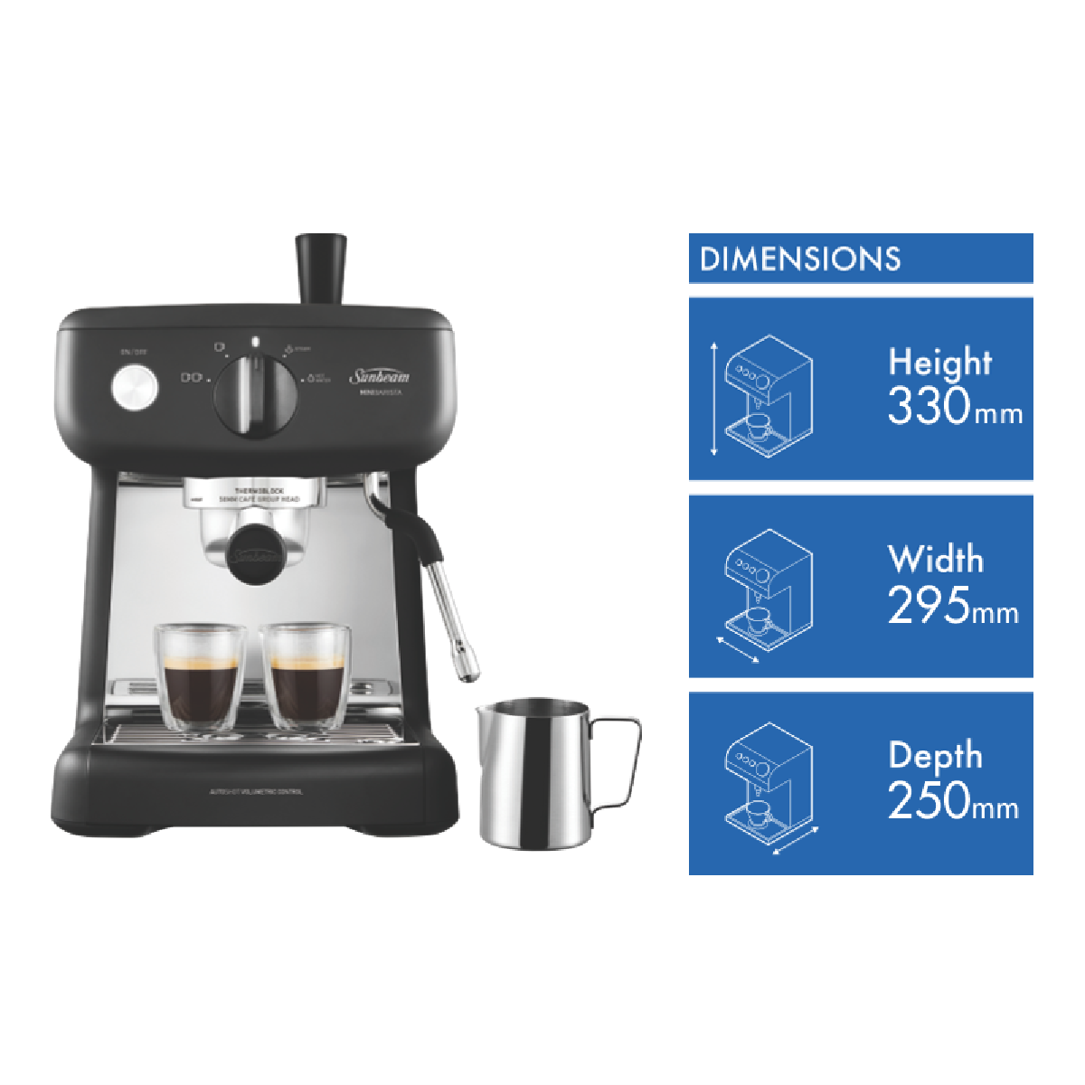 This black Sunbeam Mini Barista Espresso Machine EM4300K enables you to prepare espresso drinks in your own home. Discover optimal temperature and coffee flavour thanks to the Temp IQ Shot Control. Also whip up foaming milk for lattes and cappuccinos with its powerful steam wand and frother. Cut costs by brewing your own with this Sunbeam coffee machine.