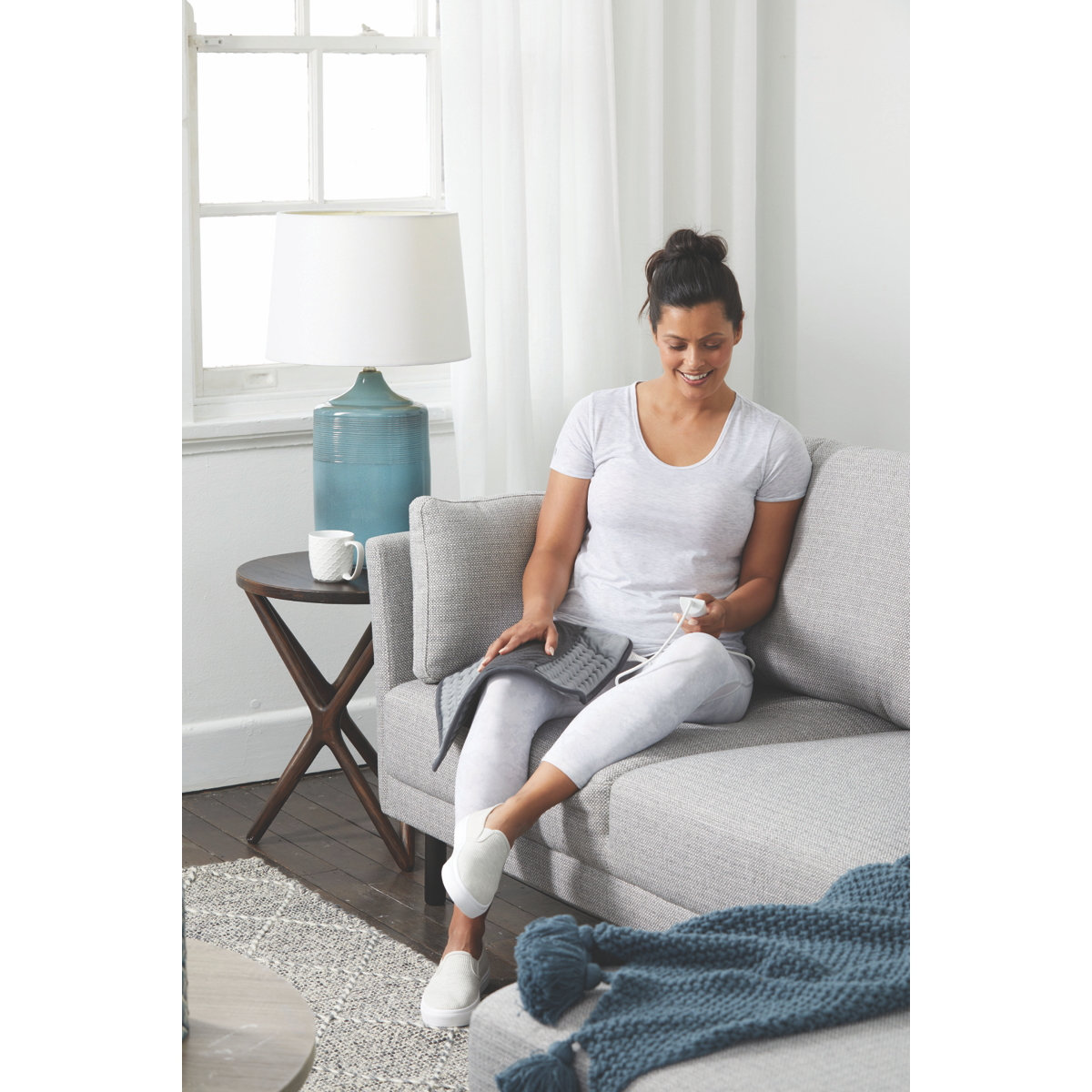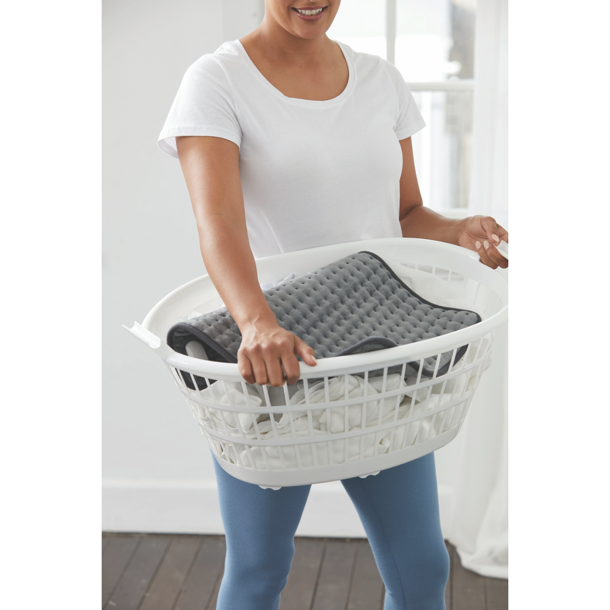Relax and soothe aches and pains with the Sunbeam Multi Purpose Heating Pad. This grey heating pad features Intellisense Technology that heats up in just 90 seconds along with 5 variable heat settings to tailor soothing warmth to your needs. The soft velvety fabric construction delivers gentle heat that relieves tension in targeted areas. Built-in auto shut off provides peace of mind turning off automatically after 3 hours of continuous use. With a 110W heating element attached controller sleeve and machine washable fabric this heating pad makes it easy to apply therapeutic warmth when and where you need it. Measuring 350 x 400mm and weighing just 0.5kg the lightweight pad conforms comfortably to the body. Backed by a 2 year manufacturer's warranty the Sunbeam Multi Purpose Heating Pad provides safe simple pain relief and relaxation. The manufacturer's part number for this product is HPM5000. Give your body the healing warmth it deserves with this multi-purpose heating pad.