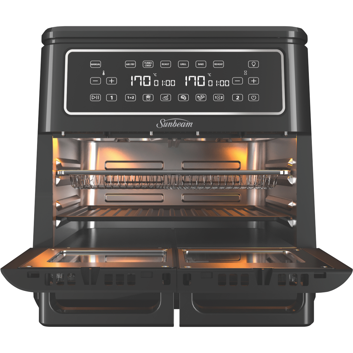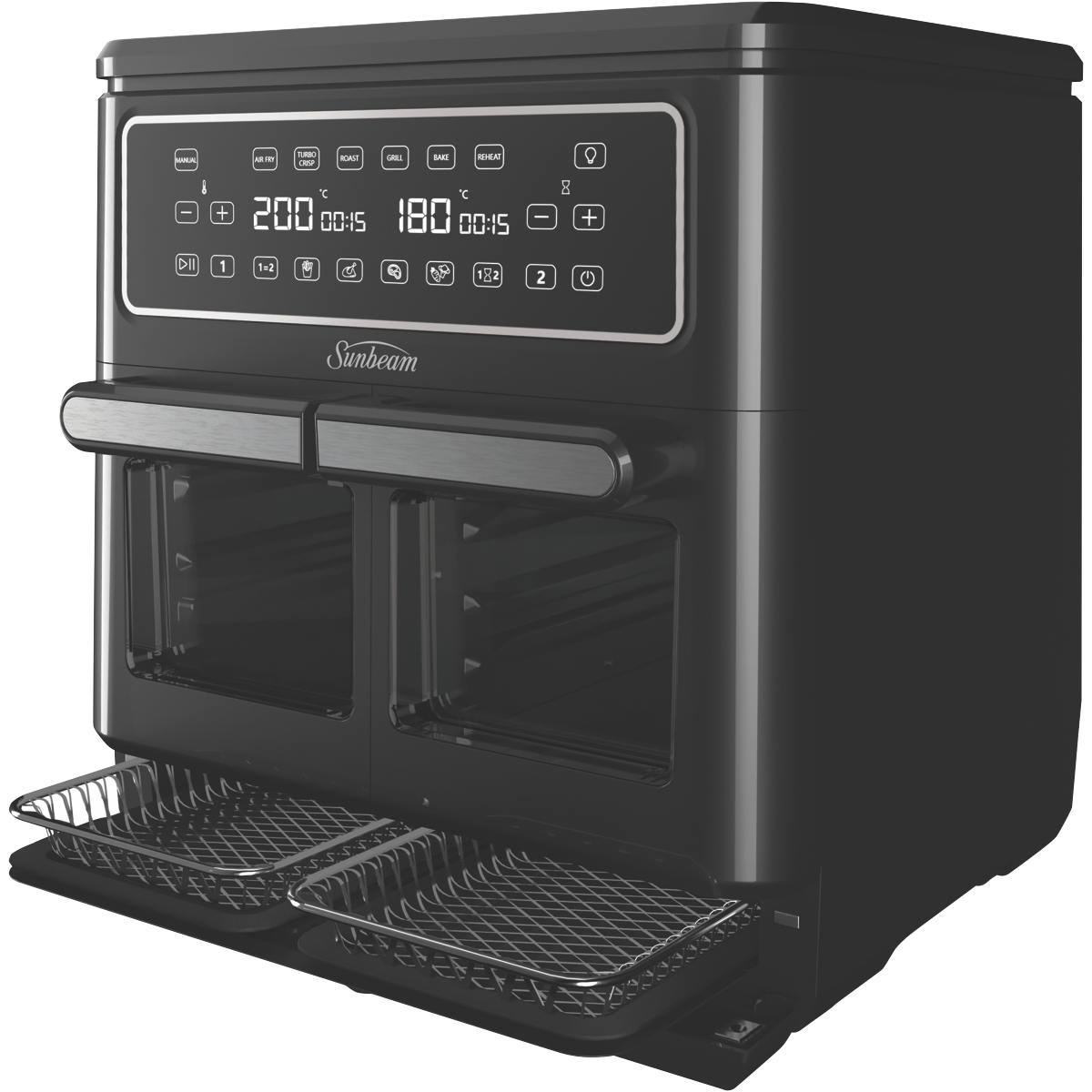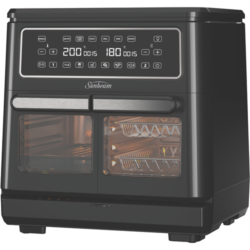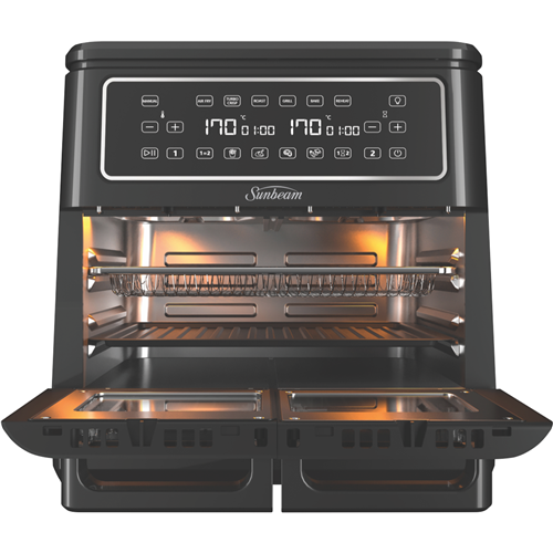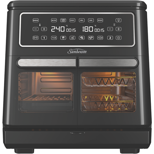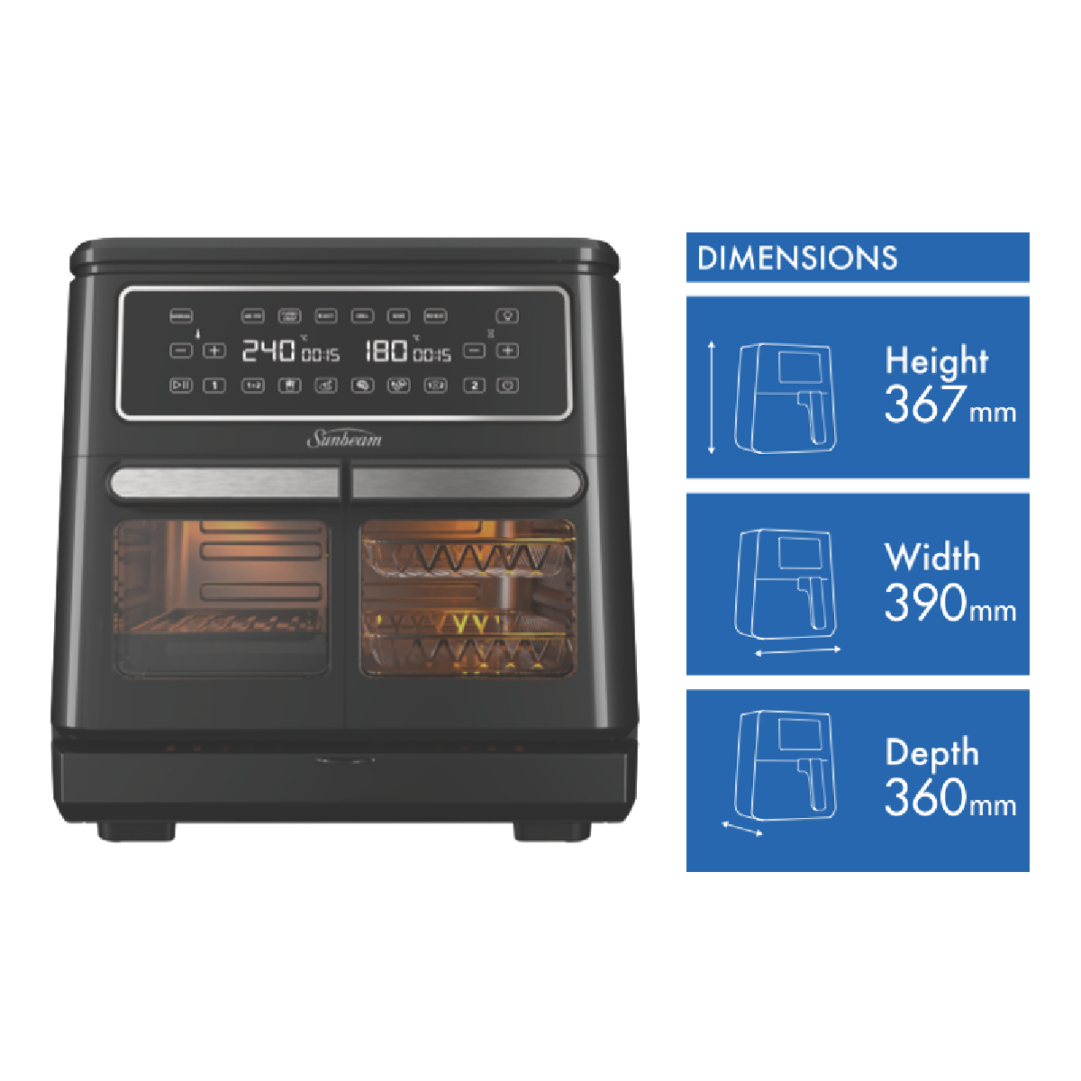 Cook multiple dishes at once with the versatile Sunbeam Multi Zone Air Fryer Oven. This 2400W air fryer features independent dual cooking zones each with a 5.5L capacity allowing you to sync and match cooking times for different foods. With a range of preset programs for fries chicken meat and veggies it takes the guesswork out of air frying. The illuminated touch controls give you precision over 11 cooking modes like Air Fry Bake Roast and Grill. Circulating hot air at high speeds the Nutricrisp Technology ensures fast even results. With 9 included accessories like baskets trays and a removable handle you can cook everything from crispy fries to juicy roasts. Promising healthier meals with little to no oil the 360 degree airflow system cooks dishes to crispy perfection. This 11.4L air fryer oven simplifies cooking multiple dishes at once with customizable time and temperature settings. The removable accessories and oven walls are dishwasher safe for easy cleanup afterwards. Measuring 39cm wide 36cm high and 36cm deep this countertop oven is an ideal addition to any kitchen. The manufacturer's part number for this product is AFP6000BK. Seamlessly multitask your cooking with the Sunbeam Multi Zone Air Fryer Oven.