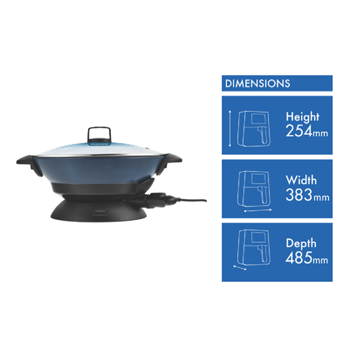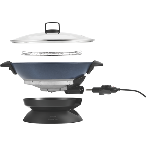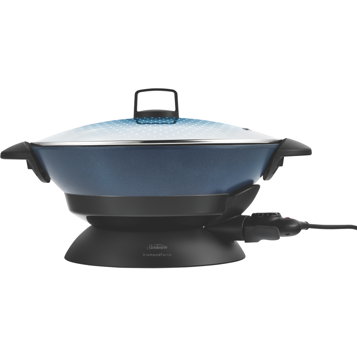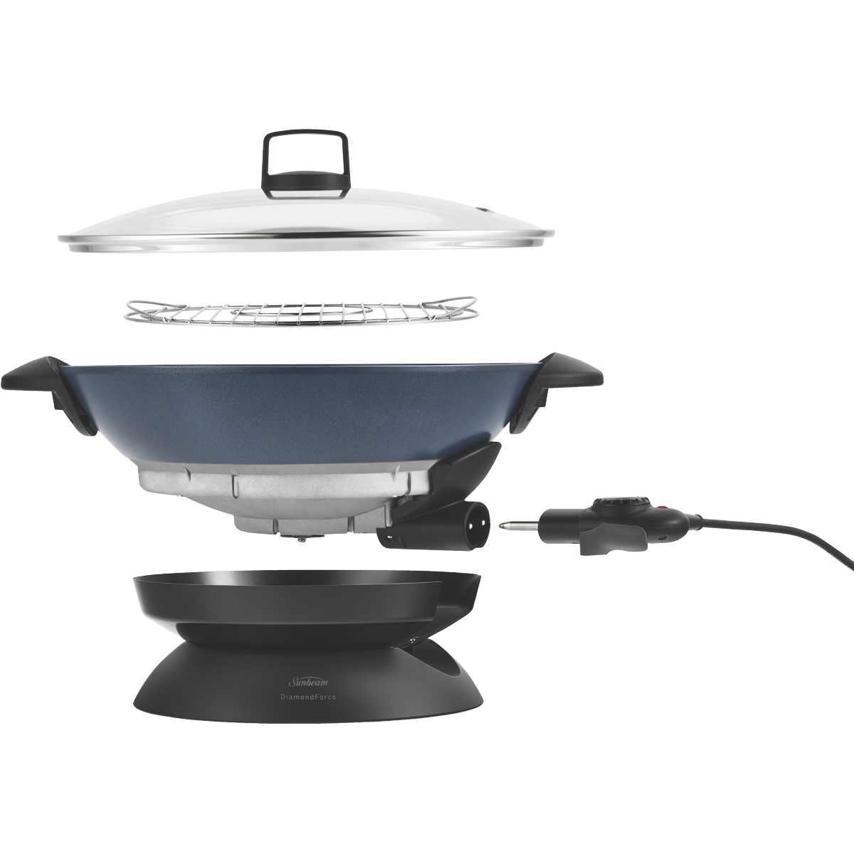 Take your wok skills to the next level with the Sunbeam Professional 7.5 Litre Diamond Force Wok. This electric wok is engineered for performance and durability with its innovative DiamondForce two layer non-stick coating that keeps food from sticking. Cook like a pro with the adjustable Perfect Temp probe that lets you precisely control the temperature. The 2400W cast-in heating element delivers fast even heating while the tempered glass lid with steam vent locks in moisture. Enjoy easy cleaning with the detachable quick release base. This wok's sleek blue and black finish will look great in any modern kitchen. The DiamondForce coating is twice as durable as standard non-stick for long-lasting performance. The dishwasher safe wok and lid add convenience to your cooking routine. Unleash your inner chef with wok recipes from stir fries to curries soups to deep frying with this versatile electric wok. It includes a handy metal steam rack for steaming dim sum and vegetables. Sunbeam designs quality kitchen appliances for delicious home cooking. The manufacturer's part number for this product is WWM7100DF. Upgrade your cookware with the Sunbeam Professional Diamond Force Wok today.