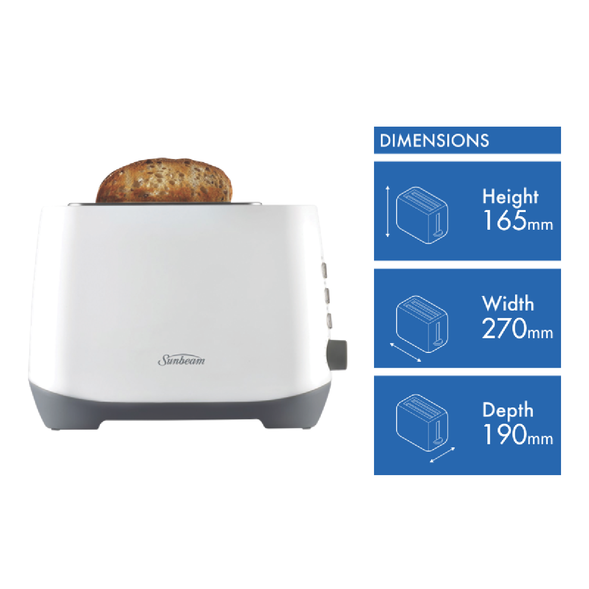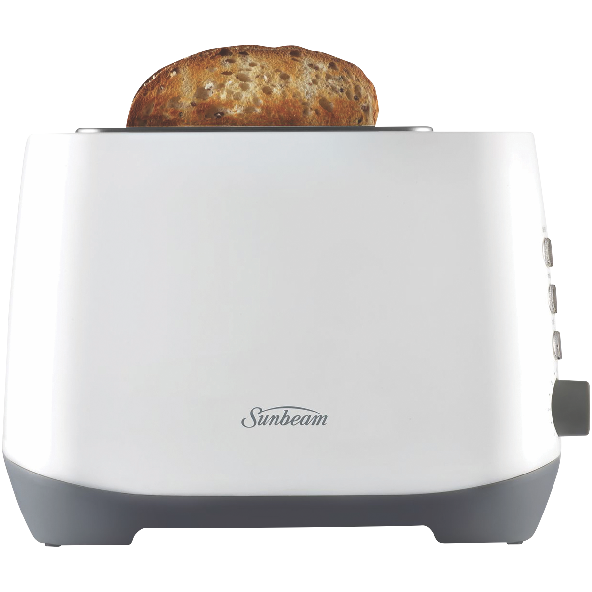 Crisp your bread to perfection with the Sunbeam Rise Up 2 Slice Toaster in sleek white. This 800W toaster features variable browning control so you can get your toast just the way you like it while the high lift lever allows for easy access. The removable crumb tray makes cleaning a breeze. With defrost and reheat functions you can quickly thaw or warm your frozen bread or pastries. The Sunbeam Rise Up Toaster ensures even toasting and includes a 1 year manufacturer's warranty for peace of mind. With its compact design and cord storage it's easy to keep on your countertop ready to toast bagels crumpets or bread anytime. Make breakfast easy with this reliable 2 slice toaster. The manufacturer's part number for this product is TAP0002WH. Bring home the perfect addition to your kitchen today.