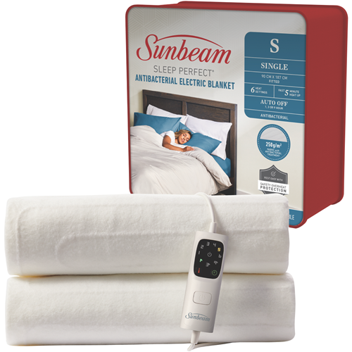 Achieve the ultimate sleep experience with the Sunbeam Sleep Perfect Fitted Antibacterial Single Electric Blanket. This soft and comfortable electric blanket features 6 adjustable heat settings to keep you warm and cozy all night long. The 250g/m2 non woven polyester fabric provides durability for long lasting use while the antibacterial treatment inhibits bacterial growth to maintain hygiene. With dimensions of 900mm width x 1870mm height and weighing just 1.53kg this electric blanket conveniently fits single beds. Fall asleep faster and wake up refreshed when you add this electric blanket to your bedding. Its 6 heat settings allow you to customize the level of warmth throughout the night. The antibacterial fabric prevents bacterial buildup so you can enjoy clean fresh bedding every night. Give yourself the gift of better sleep with the Sunbeam Sleep Perfect Fitted Antibacterial Single Electric Blanket. The manufacturer's part number for this product is BLA6321. Finally add this electric blanket to your cart today for the ultimate sleep experience.