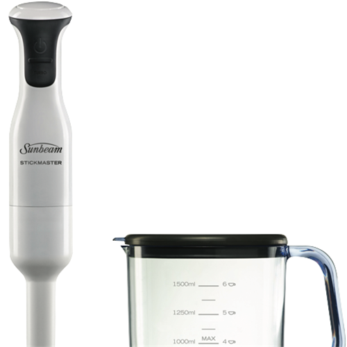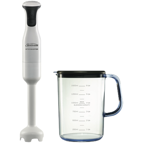 Blending pureeing and whipping made effortless with the Sunbeam Stickmaster stick mixer. Crafted with a 250-watt motor and detachable plastic shaft this white stick mixer powers through ingredients with precision and ease. The single-speed setting allows you to blend everything from cake batters to soups and smoothies while the 420mm height provides excellent reach into pots bowls and pitchers. With stainless steel blades 1.5L bowl capacity and dishwasher safe parts cleanup is a breeze. Create delicious home-cooked meals and baked goods for the whole family with the versatile Stickmaster. The manufacturer's part number for this product is SM7200. Bring culinary creativity to life in your kitchen with the Sunbeam Stickmaster today.
