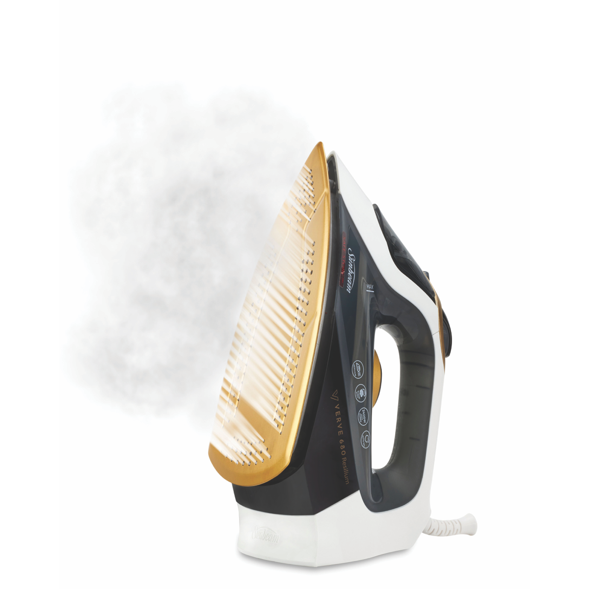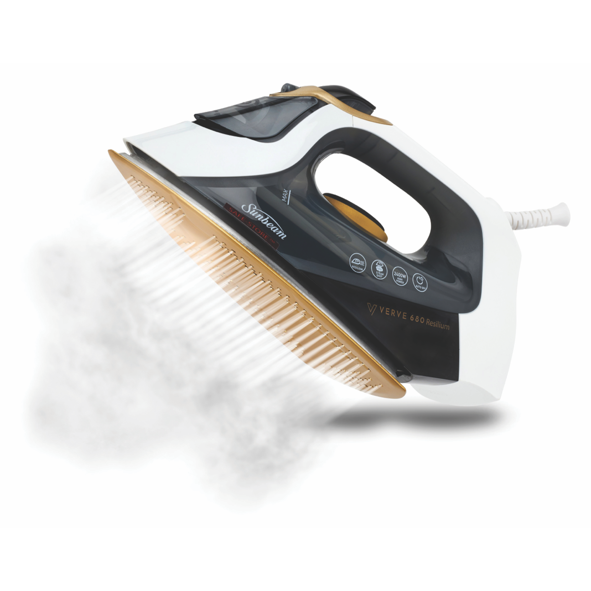 Glide effortlessly through your ironing with the Sunbeam Verve 680 Resilium Iron. This 2400W iron comes equipped with a durable Resilium anodised soleplate that provides 70% easier glide to smoothly press away wrinkles. The powerful 45g/min steam output and 160g/min steam shot allow you to tackle even the toughest creases with ease. With a 300ml water tank capacity anti-drip system and auto shut off for safety you can iron for longer without worrying about spills or overheating. Weighing just 1.72kg the Verve 680 is lightweight yet packed with features like vertical steam spray mist and a self-clean function to keep your iron in tip-top condition. Its 2500mm cord length offers great range of motion. Complete with a 24 month manufacturer's warranty this black and gold iron makes light work of ironing day after day. The manufacturer's part number for this product is SRA6800. Give your laundry an effortless press with the Sunbeam Verve 680 today.