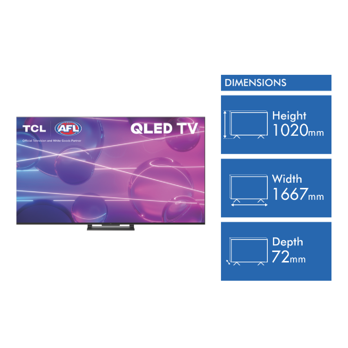 Step into an immersive viewing experience with the TCL 75 C745 QLED Google TV 23. This ultra high definition smart TV combines a massive 75-inch screen with QLED quantum dot technology for vivid colors and sharp 4K resolution. Powered by the lightning-fast AiPQ Processor 3.0 images come to life in stunning clarity and detail. Built-in Dolby Atmos delivers room-filling sound while Full Array Local Dimming provides deep blacks and brilliant highlights. With Google TV and voice control via Google Assistant or Amazon Alexa you can easily find and play content from across your favorite apps like Netflix Stan and YouTube. Gaming is silky smooth thanks to Auto Game Mode FreeSync Premium Pro up to 144Hz refresh rate and ultra-low latency. Connectivity is a breeze with 4 HDMI and 2 USB inputs. Bring home cinema magic into your living room today with the brilliant TCL 75 C745 QLED Google TV. The manufacturer's part number for this product is 75C745.