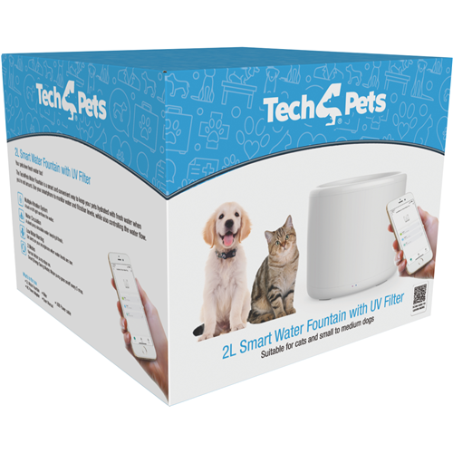 The Tech4Pets 2L Smart Water Fountain provides your pet with a constant supply of clean filtered water. This white water fountain circulates and aerates water to keep it fresh while the replaceable filter removes impurities. With its generous 2 litre capacity you can leave your furry friend hydrated all day without constantly refilling. The fountain's smart design reduces spills and the low-noise pump won't disturb your pet. Give your cat or dog the gift of cool clean water with the Tech4Pets fountain. Its contemporary styling looks great in any home. For convenient spill-free hydration choose the Tech4Pets 2L Smart Water Fountain. Backed by a 1 year manufacturer's warranty. The manufacturer's part number for this product is T4P-WATER-F2L. Check out this innovative water fountain for your pet today.
