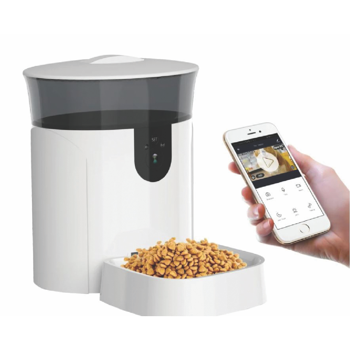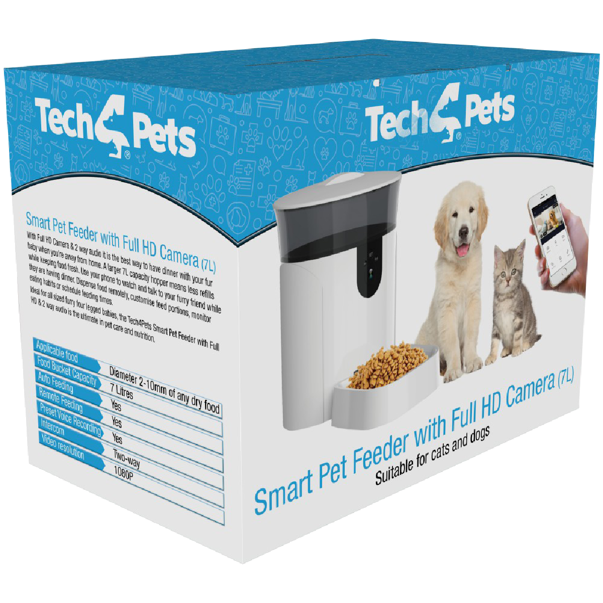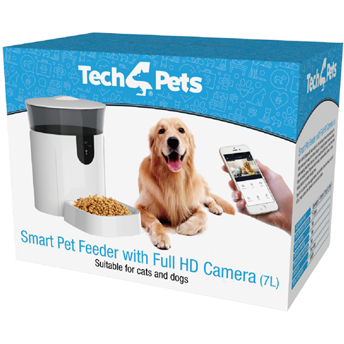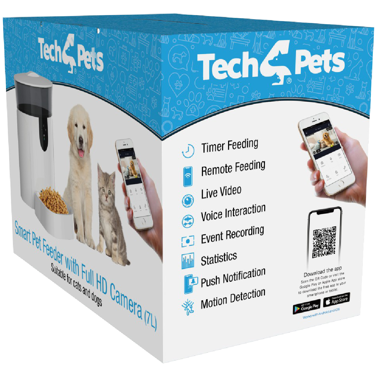 The Tech4Pets 7L Smart Pet Feeder with 1080P Camera helps pet owners feed their furry friends even when they can't be there. This smart pet feeder dispenses measured portions of food on a schedule allowing you to monitor and control your pet's meals remotely. With two-way audio you can hear your pet and even talk to them through the mobile app. The 1080P camera lets you check in on your pet anytime. Just launch the app and you'll be connected right away. With Google Assistant and Amazon Alexa compatibility you can operate it completely hands-free. Power it with the included USB cable and wall adapter. Then connect it to your home's WiFi network and you'll be able to feed your pet from anywhere. Give your pet the gift of healthy portion control and enrich their mealtimes with your voice and face through the camera. Never worry about an empty food bowl again with the Tech4Pets Smart Pet Feeder. It comes with a 1 year manufacturer's warranty. The manufacturer's part number for this product is T4P-FEEDCAM7L. Bring home smart pet care with the Tech4Pets 7L Smart Pet Feeder today.