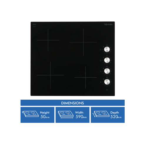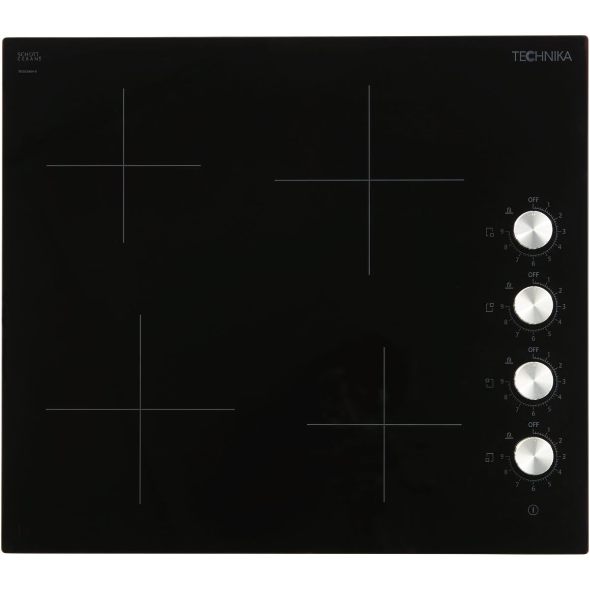 This Technika 60cm Ceramic Cooktop has four burners with nine power levels at each one for exact control over your cooking. At the side rotary knob controls select from 1 or 2 for melting delicate sauces right through to 9 for stir-frying or boiling. The Technika TGGCM64-5 features residual heat indicators so you know which zone is still too hot to touch after you've finished cooking and an auto safety cut-off feature that automatically switches off the zone after a set period of inactivity in case it was accidentally left on. It has an on/off touch setting. With premium Schott ceramic glass the cooktop surface is durable and easy to keep clean in between cooking sessions.