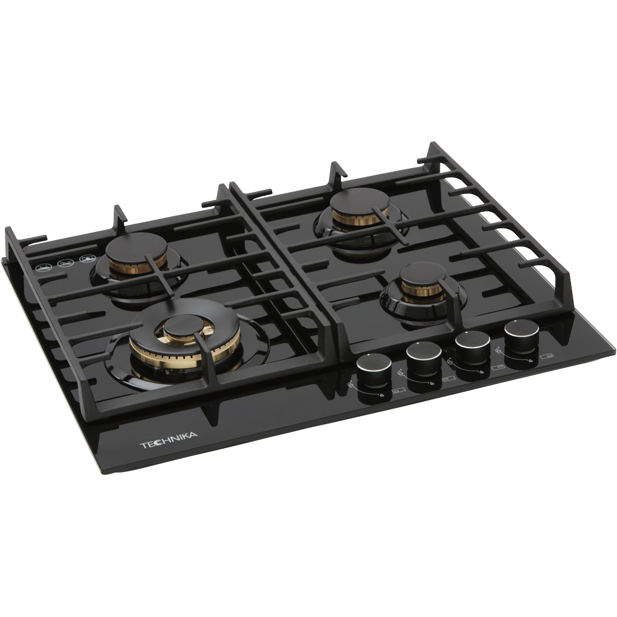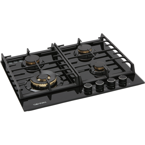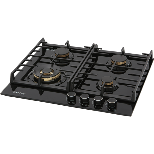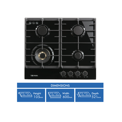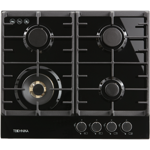 This black gas-on-glass cooktop by Technika offers a striking yet minimalist aesthetic to integrate beautifully into any kitchen upgrade. Achieve your stir-fry creations with ease at the front high-efficiency wok burner as you sear simmer or boil on the other three burners. The Technika TGC6GBK features electronic ignition so you can get to the level of gas you need very quickly by operating the conveniently-positioned front control knobs. This black glass gas cooktop is fitted with a flame failure device at each of the four burners for safety. And keeping the surface clean is virtually effortless thanks to the glass finish that cleans well with a wipe and a damp cloth or with a little detergent for more stubborn residue - just remember to wait until the surface has cooled down before cleaning.