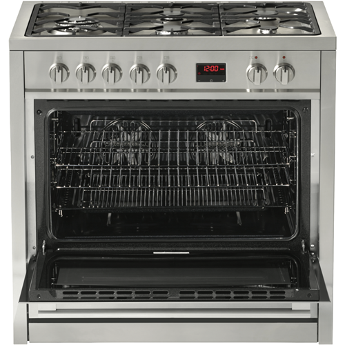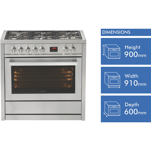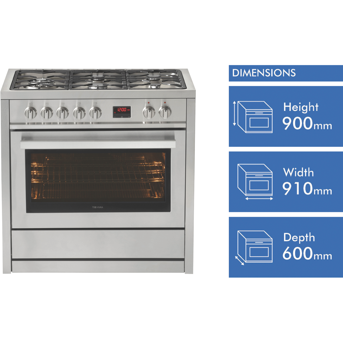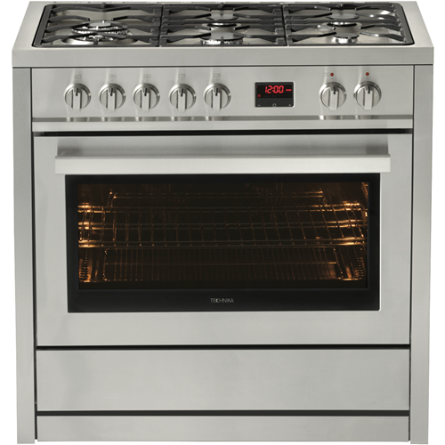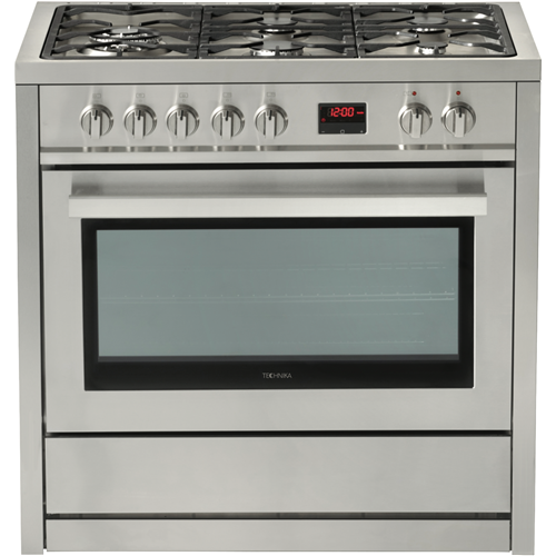 This stainless steel Technika 90cm Dual Fuel Upright Cooker TEG95DUA-2 is an electric oven and gas cooktop in one convenient appliance available exclusively from The Good Guys. Bake cakes and desserts or a large family meal in the 105-litre nett usable capacity oven as you have side dishes cooking on any of the five gas burners that are generously spaced out for easy manoeuvring. This Technika freestanding oven features a high-efficiency triple ring wok burner for high-powered stir-frying searing or boiling. For all your grilling baking and cooking needs select from one of eight oven cooking functions at the turn of the dial. With this Technika professional series stainless steel oven you can expect great functionality in a modern stylish design.