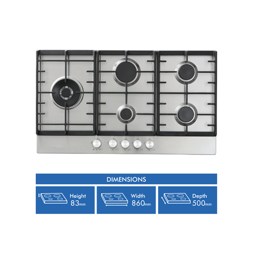 Additional Features 5 x Italian Sabaf aluminium gas burners, High power dual-valve wok burner, Flame failure safety device