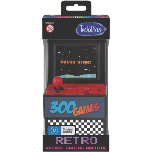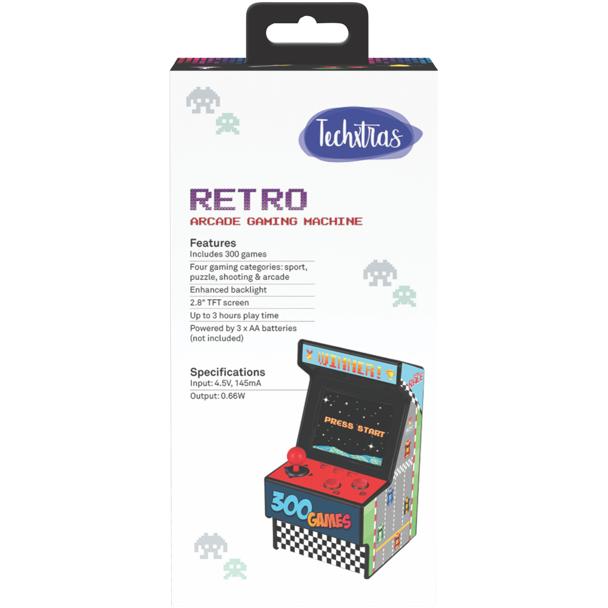 Bring the feel of retro gaming to life with the Techxtras 300-in-1 Retro Games Machine in striking red. This portable console lets you enjoy a blast from the past with 300 built-in classic games. With no cartridges needed simply plug in this lightweight travel-friendly unit and start playing your favorite 8-bit and 16-bit games from the 80s 90s and 2000s eras. Featuring a large 2.8 color screen this retro device delivers vivid graphics and crisp sound effects. The ergonomic design includes responsive controls suitable for games of skill and quick reflexes. Connect this versatile system to your TV or monitor to enjoy big screen gameplay via the AV out port. Powered through USB it's compatible with most chargers power banks and laptops. Offering hours of entertainment at your fingertips the Techxtras 300-in-1 Retro Games Machine brings back fond memories of classic gaming. The manufacturer's part number for this product is GAR11116. Rediscover the magic of retro gaming with this versatile all-in-one system.