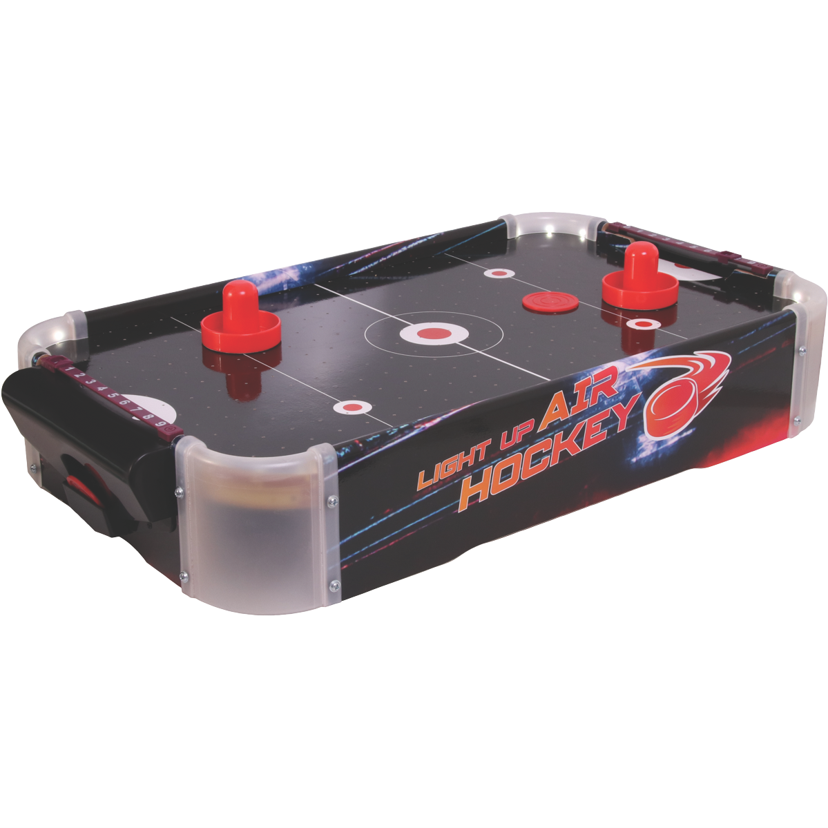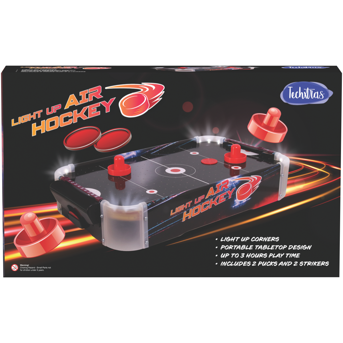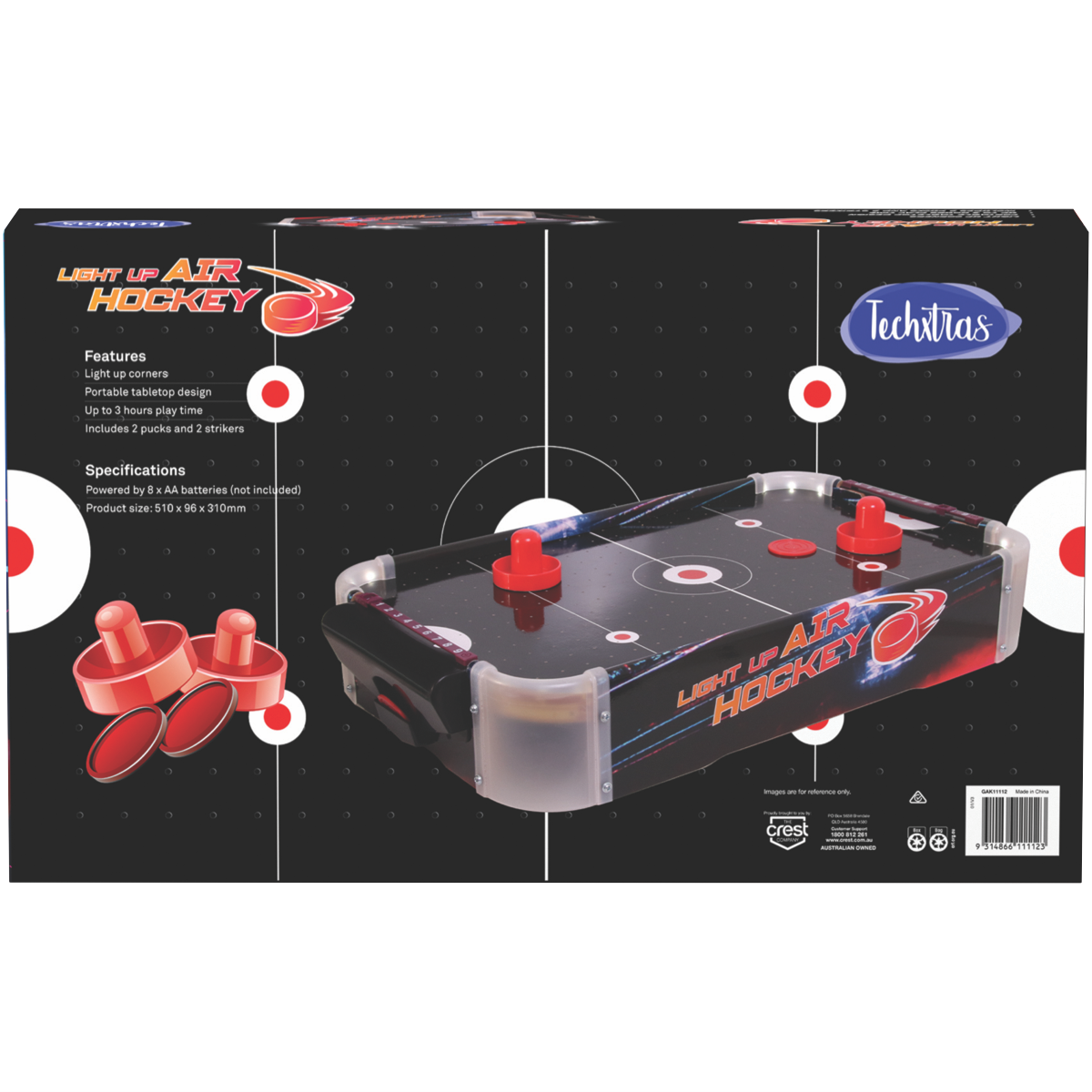 In need of a fun portable game to light up your next gathering? The Techxtras Light Up Tabletop Ice Hockey is the perfect pick. This compact black hockey game fits anywhere so you can play a quick match with friends or family anytime. With bright LED lights that illuminate the rink you ll be immersed in exciting hockey action. Play offense and slide the strikers to score on the goalie or play defense and block shots. With smooth game play and an official rink and strikers it feels just like you re on the ice. The Techxtras Light Up Tabletop Ice Hockey game is battery operated so you can play anywhere tabletop. Bring it along in the car or take it outside for an exciting match during barbecues or parties. Have a blast competing against someone else or play on teams for hours of entertainment. A one year warranty ensures you can keep enjoying this portable hockey game for a long time. The manufacturer's part number for this product is GAK11112. Bring home the Techxtras Light Up Tabletop Ice Hockey for endless hockey fun.