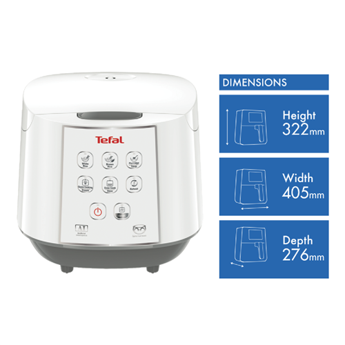 Step up your rice and slow cooking game with the versatile Tefal Easy Rice & Slow Cooker. This all-in-one multicooker features 8 preset programs to perfectly cook white rice brown rice porridge soup stews steam vegetables quickly reheat leftovers and keep meals warm for up to 12 hours. The high-quality non-stick inner pot with multilayer coating allows effortless food release and easy cleanup. The integrated steaming basket lets you steam veggies and side dishes while rice cooks below. Programmable up to 8 hours the Slow Cook mode tenderizes meats and stews for family-friendly favourites. An ample 10 cup capacity feeds the whole household. This Rice Cooker & Steamer from Tefal is designed with convenience in mind. The compact 322mm height fits neatly on countertops. Removable parts like the steam tray bowl and spatula are top-rack dishwasher safe for fast cleanup. Prepare perfectly cooked rice and so much more using Tefal s thoughtful presets. This multicooker comes complete with a measuring cup rice spatula soup spoon steam basket and 2 year warranty. The manufacturer's part number for this product is RK732. Discover how easy home-cooked meals can be with the Tefal Easy Rice & Slow Cooker.