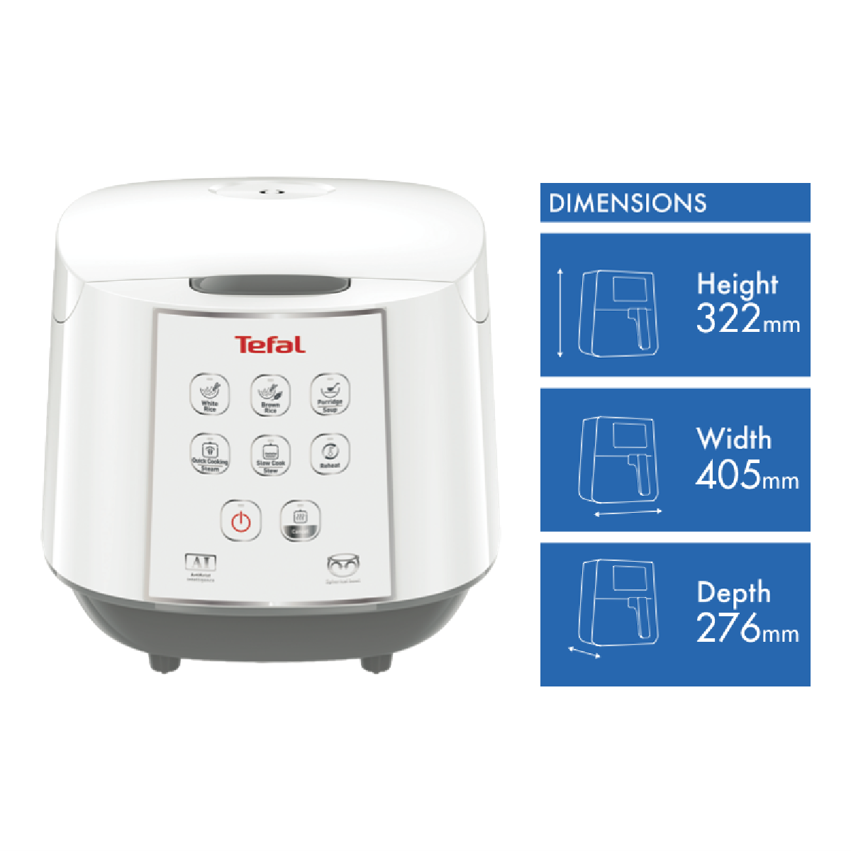 Programs 8, White rice, brown rice, porridge/soup, slow cooking/stews (8 hours), steam, quick cooking, reheat, keep warm (12 hours)