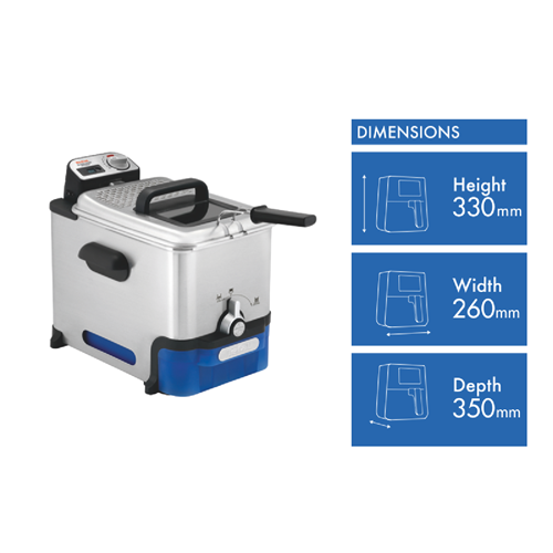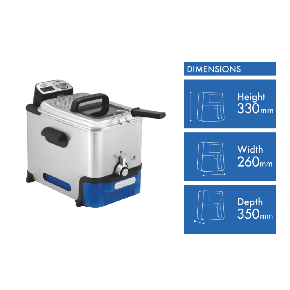 Additional Features Removable Stainless Steel Bowl, Digital Timer, 3.3-3.5L Oil Capacity, 1.2kg Food Capacity, Fine Mesh Filter, Adjustable Temperature from 150 -190 degrees, Automatic Oil Filtration