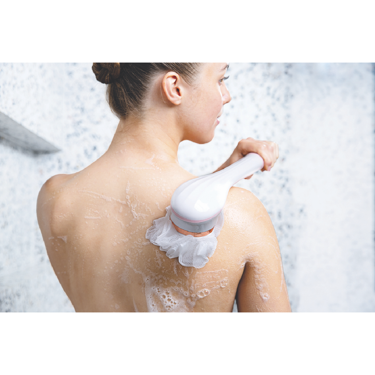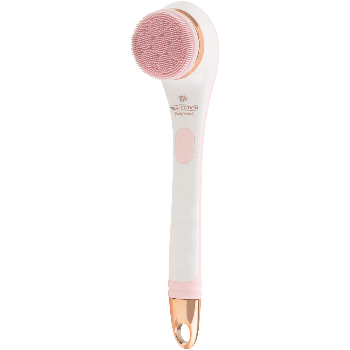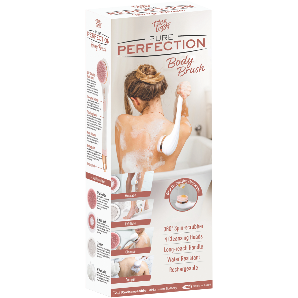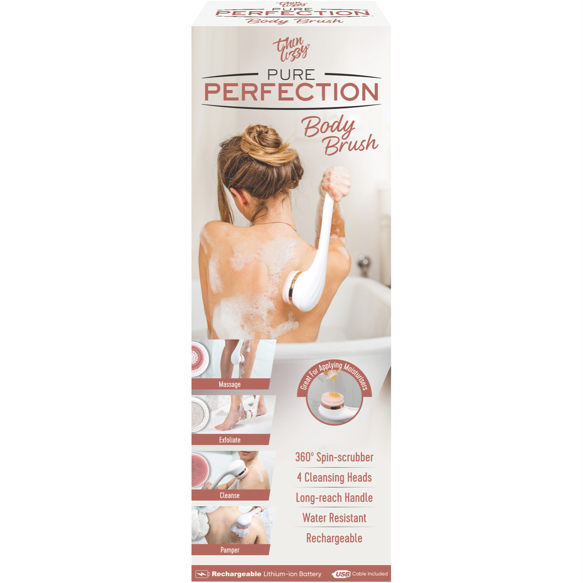 Experience the ultimate at-home spa treatment with the Thin Lizzy Pure Perfection Body Brush. This handheld massager features a rechargeable lithium-ion battery and comes equipped with 360 degree spinning heads for a pampering cleanse. The extra long handle makes it easy to reach your back. Choose between two speeds - gentle for sensitive skin or massaging for an invigorating scrub. The four multifunction heads include a loofah pumice stone silicone brush and bristle brush to exfoliate smooth and nourish. An in-built hanging hole allows convenient storage in the shower. Give yourself a luxurious spa-like experience in the comfort of home with this versatile massager. The Thin Lizzy Pure Perfection Body Brush will leave your skin feeling soft smooth and revitalized. The manufacturer's part number for this product is TLR_PP_BB. Treat yourself to a little self-care today.