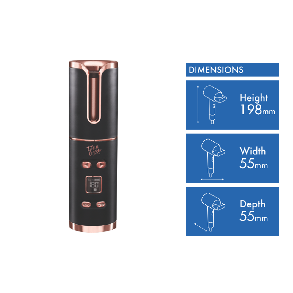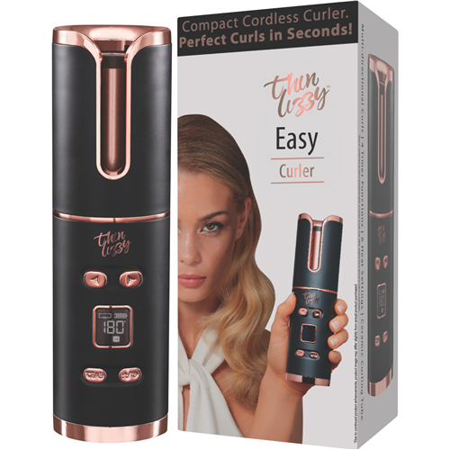 Transform your locks with the revolutionary Thin Lizzy UCurl Auto Curler. This innovative hair curling appliance allows you to achieve salon-worthy curls in the comfort of your own home. The sleek black and rose gold barrel not only looks chic but it heats up in seconds to create defined ringlets beachy waves or bouncy curls. With 6 customizable heat settings and 4 timer options you can tailor the styling experience to suit your hair type and desired look. The multi-directional barrel rotates to curl hair inwards outwards or alternating directions for versatile styling. Advanced ceramic heating gently styles hair while locking in moisture reducing frizz and protecting from damage. The safety guards provide peace of mind and prevent burns or snags. This lightweight compact curler is perfect for fine medium or thick hair and features a handy USB charging port for ease of use. Achieve glamorous bouncy curls whenever you want with the Thin Lizzy UCurl. The manufacturer's part number for this product is TLR_UC_BLK_V2. Add this innovative styling tool to your collection today and unlock endless curl creations.