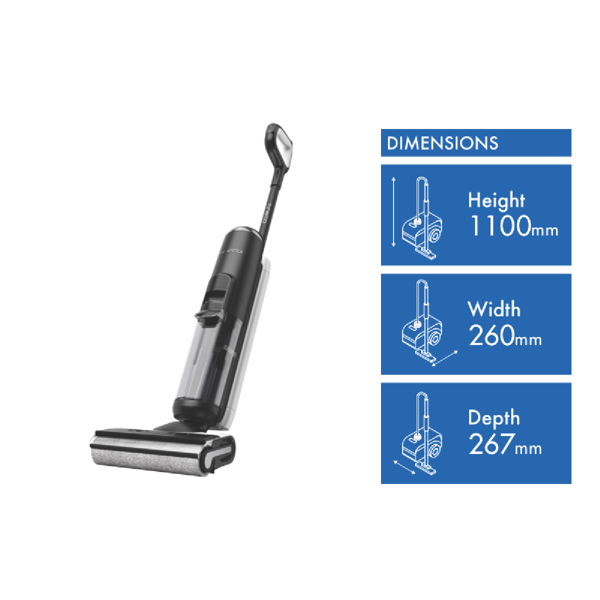 Cleaning your sealed hard floors just got a whole lot easier with the Tineco One S6 Pro Extreme Hard Floor Cleaner. This cordless cleaner in sleek white and black has a generous 0.8L clean water capacity and a 0.72L dirty water tank so you can clean more in one go. At just 4.5kg it's lightweight and easy to maneuver around your home with its 1100mm height 260mm width and 267mm depth. The box includes everything you need: the FW112000AU cleaner a cleaning tool 500ml cleaning solution two extra brush rollers a dry filter adapter and charging dock. Plus enjoy peace of mind with a 2-year manufacturer's warranty.