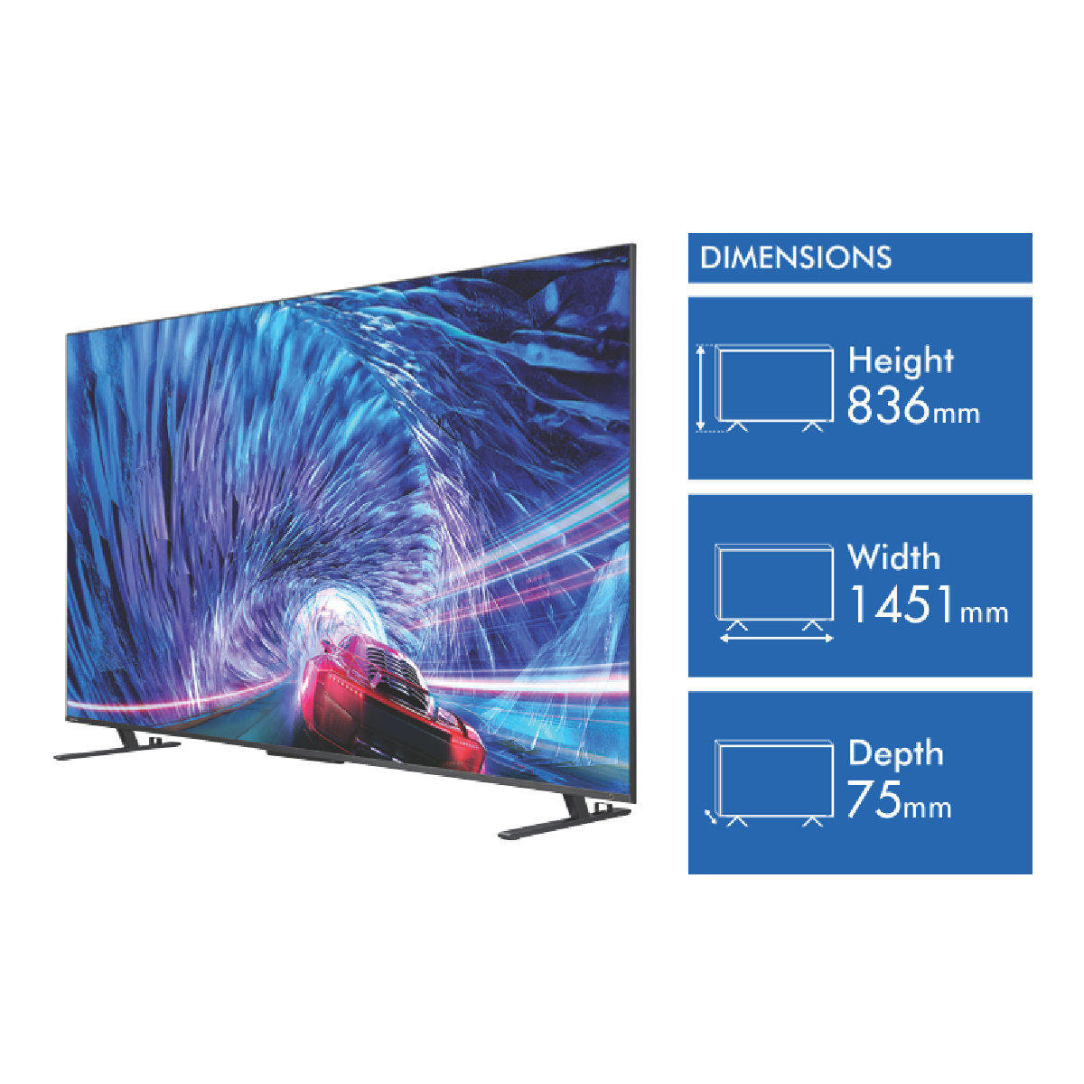 Step into an immersive viewing experience with the Toshiba 65 Z670MP 4K UHD Smart TV 23. This 65-inch LED TV delivers stunningly realistic 4K Ultra HD resolution powered by Toshiba's Quad Core REGZA Engine producing over 8 million pixels for lifelike clarity and detail. Quantum Dot Colour technology renders over a billion hues for true-to-life colour reproduction. Full Array Local Dimming optimizes contrast by individually adjusting multiple backlight zones. Supporting today's major HDR formats including HDR10+ Dolby Vision and Dolby Vision IQ this TV unleashes the full visual potential of HDR content. With Dolby Atmos built-in audio comes to life with moving multi-dimensional sound. Gaming is smoother with up to 240Hz refresh rate. Running on the user-friendly VIDAA U7 Smart TV platform access popular apps like Netflix and Youtube and use built-in voice control. Designed for durability with a sleek modern style the Z670MP series delivers an immersive home entertainment hub. With 4 HDMI and 2 USB inputs you can connect all your devices. This TV comes with a 2 year manufacturer's warranty. The manufacturer's part number for this product is 65Z670MP. Bring home a cinematic viewing experience with this feature-packed Toshiba 65-inch 4K UHD Smart TV today.
