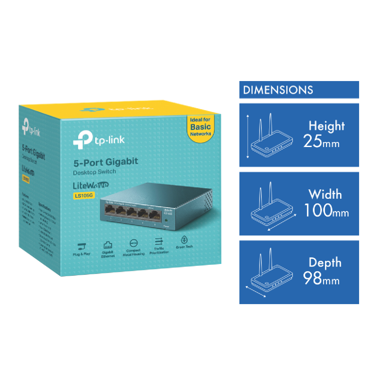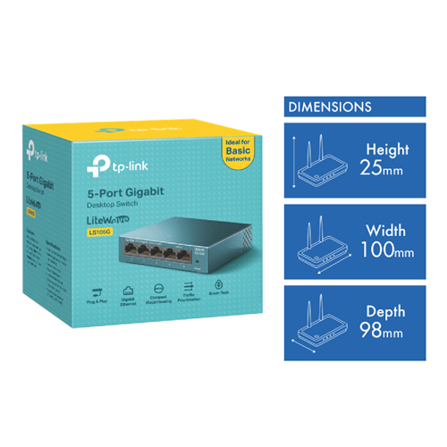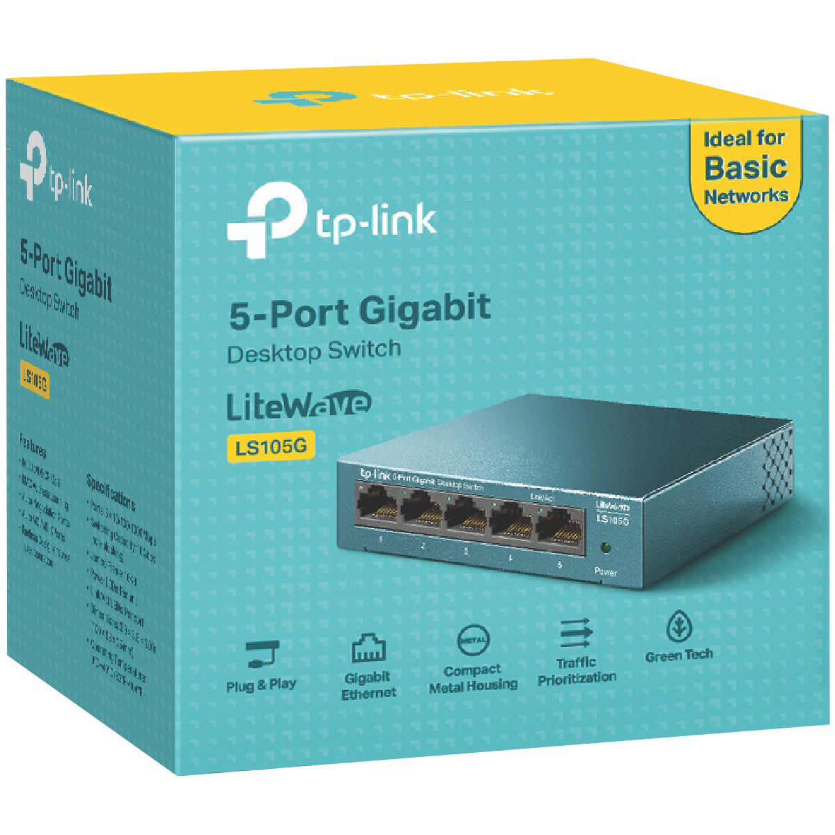 This stylish TP-LINK 5-Port Gigabit Desktop Switch streamlines your network with its five high-speed Ethernet ports. The LS105G switch boasts a fast 2000 MB/s data transfer speed to maximize network performance. Its compact size and sleek blue design make it an ideal addition to any desktop or workstation. This handy device features auto-detecting ports that automatically adjust for optimal connectivity. Measuring just 25mm in height and under 100mm in width and depth the TP-LINK switch fits neatly into any workspace. Upgrade your network connectivity and enjoy lag-free transfers and uninterrupted streaming with this versatile desktop switch. Whether you need extra ports for your peripherals or a speed boost for bandwidth-hungry tasks the TP-LINK 5-Port Switch delivers. With its plug-and-play setup and quiet operation this is a fuss-free way to expand your network. The manufacturer's part number for this product is LS105G. For hassle-free high-speed networking choose the TP-LINK 5-Port Gigabit Desktop Switch.