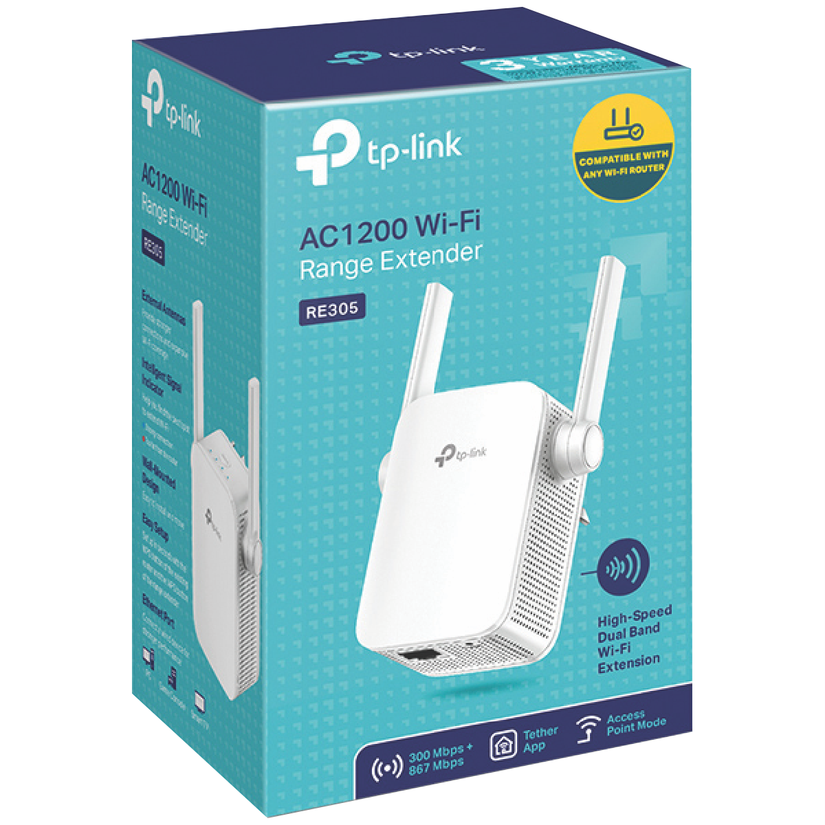 Bring your home's Wi-Fi to life with the TP-LINK AC1200 Wi-Fi Range Extender. This dual band extender expertly eliminates dead zones by delivering stable wireless coverage across two bands operating at 300Mbps over 2.4GHz and 867Mbps over 5GHz for combined wireless speeds of up to 1.2Gbps. The sleek compact design blends any décor with its contemporary glossy white finish. Tackle buffering and drop outs room to room with the RE305's seamless uninterrupted Wi-Fi expansion. Surf stream and game lag-free with this leading extender's high-speed Wi-Fi amplification. Connect devices via the handy Gigabit Ethernet port when desired. Beef up your wireless security using the range extender's 64/128-bit WEP encryption alongside WPA/WPA2 firewall protections. Lightweight and discreet install the device in minutes with its intuitive quick start guide. From home offices to 4K streaming in living rooms unlock a reliably robust Wi-Fi experience across all your spaces with TP-LINK's AC1200 Wi-Fi Range Extender. The manufacturer's part number for this product is RE305. Check out the RE305 today to enhance your wireless network.