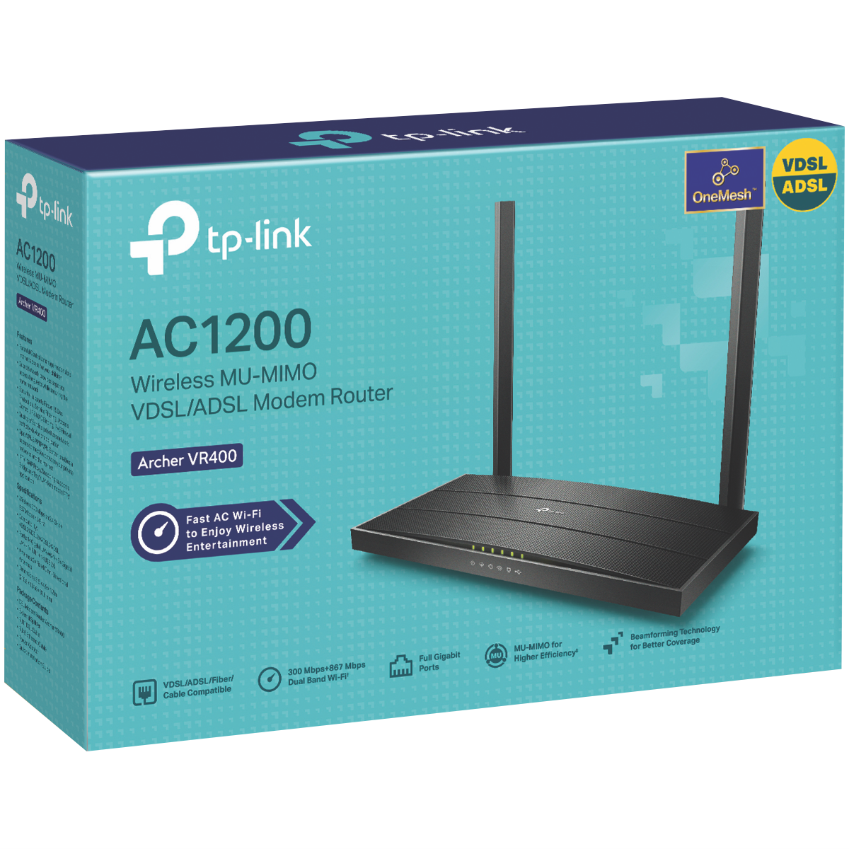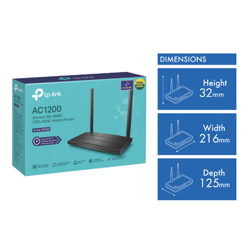 Experience faster speeds and wider coverage with TP-LINK's AC1200 Wireless MU-MIMO VDSL/ADSL Modem Router. This black modem router delivers combined wireless speeds of up to 1167Mbps allowing you to stream game and browse seamlessly across multiple devices. Equipped with the latest 802.11ac Wi-Fi technology Beamforming ensures stable connections while two high-gain antennas provide superior range for whole-home coverage. With seven Gigabit ports you can connect wired devices for lag-free online gaming and 4K UHD streaming. It also features a built-in VDSL/ADSL modem for high-speed DSL internet. Protect your network with robust security protocols like firewalls wireless encryption access control and more. Control your network with the intuitive Tether app. Measuring just 31.6mm high 215.6mm wide and 124.6mm deep this compact router integrates smoothly into any home setup. TP-LINK backs the Archer VR400 with a 3 year manufacturer's warranty. The manufacturer's part number for this product is Archer-VR400. Take your wireless network to the next level with TP-LINK's Archer VR400.