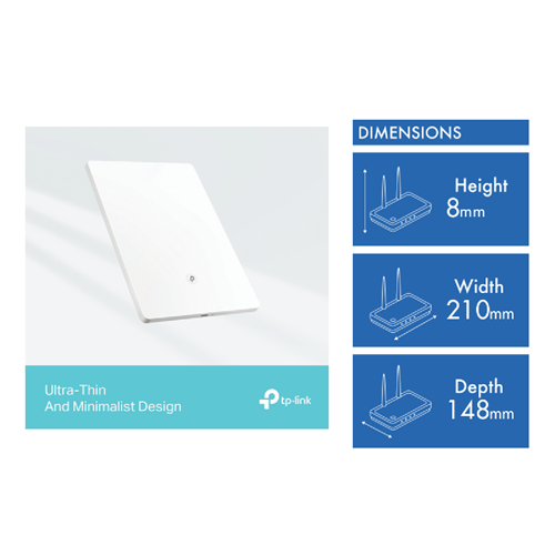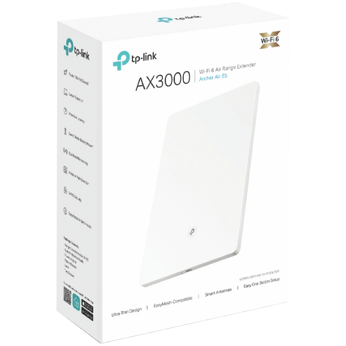Bring home the latest in Wi-Fi technology with the TP-Link AX3000 Dual Band Wi-Fi 6 Air Range Extender an easy-to-use solution for eliminating dead zones and boosting your wireless network. This sleek white extender delivers faster dual-band AX3000 Wi-Fi with combined speeds up to 3Gbps ensuring full coverage for even the largest homes. Setup takes just minutes with the intuitive Tether app providing hassle-free access to next-gen Wi-Fi 6 for all your devices. With WPA3 encryption the Archer E5 safeguards your network without compromising speed or reliability. Four internal antennas extend your existing router's signal into hard-to-reach areas for lag-free streaming gaming conferencing and more. Weighing just 0.42kg and measuring 210mm wide this compact unit fits discreetly into any space. Enjoy greater range and blisteringly fast AX Wi-Fi speeds for smart homes and 4K streaming with the TP-Link AX3000 Dual Band Wi-Fi 6 Air Range Extender. Backed by a 3 year warranty from TP-Link.