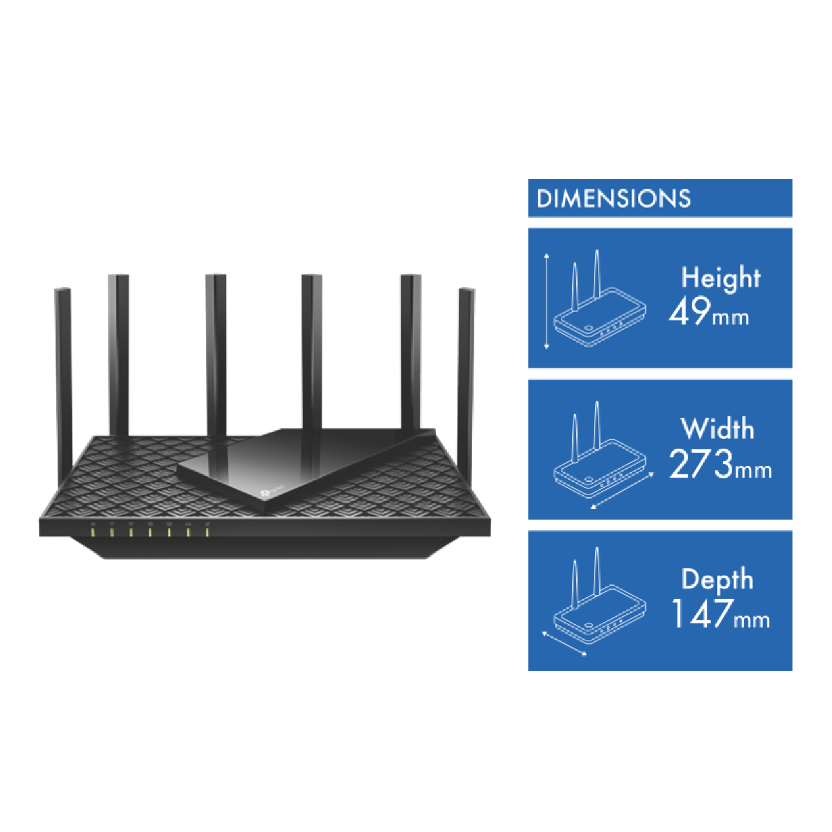 Take your home Wi-Fi to the next level with the TP-LINK AX5400 Dual-Band Gigabit Wi-Fi 6 Router. This powerful black router provides fast and reliable Wi-Fi coverage throughout your home with speeds up to 5400 Mbps and the latest Wi-Fi 6 technology. Six external antennas extend your wireless range while the 1.5GHz triple-core processor delivers lag-free performance even when multiple devices are connected. With four Gigabit LAN ports one Gigabit WAN port and a USB 3.0 port you'll have plenty of wired and storage expansion options. Protect your network and connected devices with the router's comprehensive security features including firewall access control IP and MAC address binding. Advanced technologies like MU-MIMO OFDMA and beamforming focus and strengthen your Wi-Fi signal where you need it most. Easy to set up and manage this router helps you get the most out of your broadband connection. With extensive coverage blazing-fast speeds and robust security the TP-LINK AX5400 Wi-Fi 6 Router brings you one step closer to the future of wireless connectivity. The manufacturer's part number for this product is ARCHER AX73. Check out this powerful Wi-Fi 6 router to upgrade your home network today.