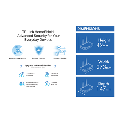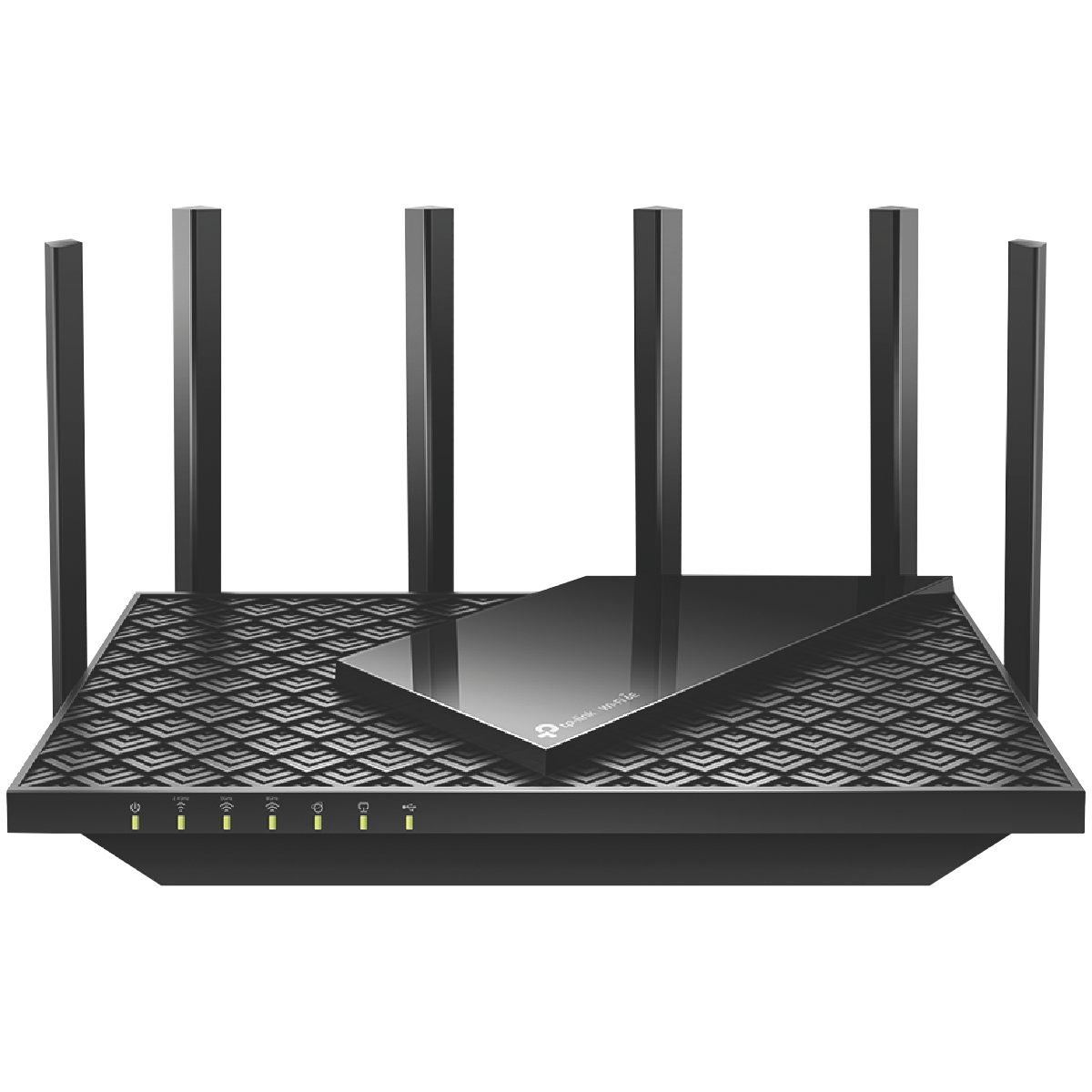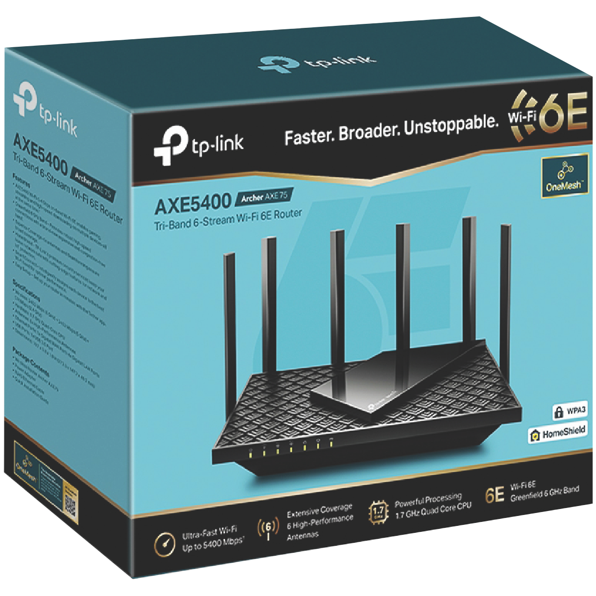 The TP-Link AXE5400 Tri-Band Wi-Fi 6E Router delivers lightning-fast 5400 Mbps Wi-Fi speeds to power your smart home. With quad-core processing and 6 high-performance antennas this black router blankets medium to large homes with strong Wi-Fi forming a signal-boosting array to cover more directions. Connect all your devices with 6 Gigabit Ethernet ports 1 WAN port and 4 LAN ports plus USB 3.0. Advanced features like HomeShield security real-time IoT protection and intrusion prevention give you peace of mind. With support for the new 6GHz band the AXE75 ushers in the new era of Wi-Fi 6E for less interference. This future-proof router brings lag-free 4K/8K streaming VR gaming video conferencing and more to homes with 2-3 bedrooms. The manufacturer's part number for this product is ARCHER AXE75. Step up to the next generation of Wi-Fi with TP-Link.