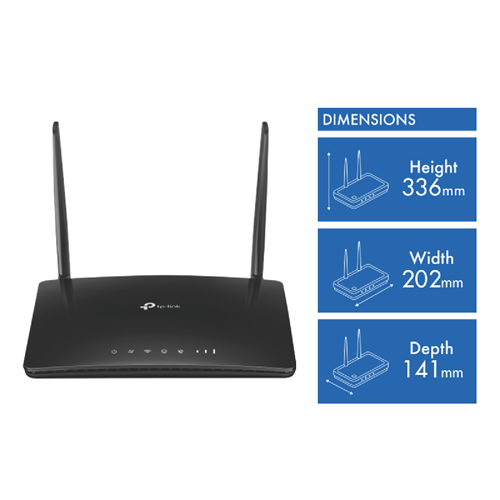 Get ready to experience fast reliable wireless connectivity with the TP-LINK N300 4G LTE Telephony WiFi Router. This sleek black router provides speeds up to 300Mbps on the 2.4GHz frequency allowing you to stream download and surf lag-free. With 4 Gigabit LAN ports you can connect multiple wired devices like smart TVs game consoles and computers. The integrated 4G LTE with support for two external antennas keeps you online even when your fixed internet is down. WPA and WPA2 encryption ensure your network stays secure from intruders. At just 336mm high and 202mm wide this router's compact design fits into any home or office. With 3 years of warranty from TP-LINK you can enjoy long-term peace of mind. The manufacturer's part number for this product is TL-MR6500V(APAC). For fast and reliable wireless connectivity check out the TP-LINK N300 4G LTE Telephony WiFi Router today.