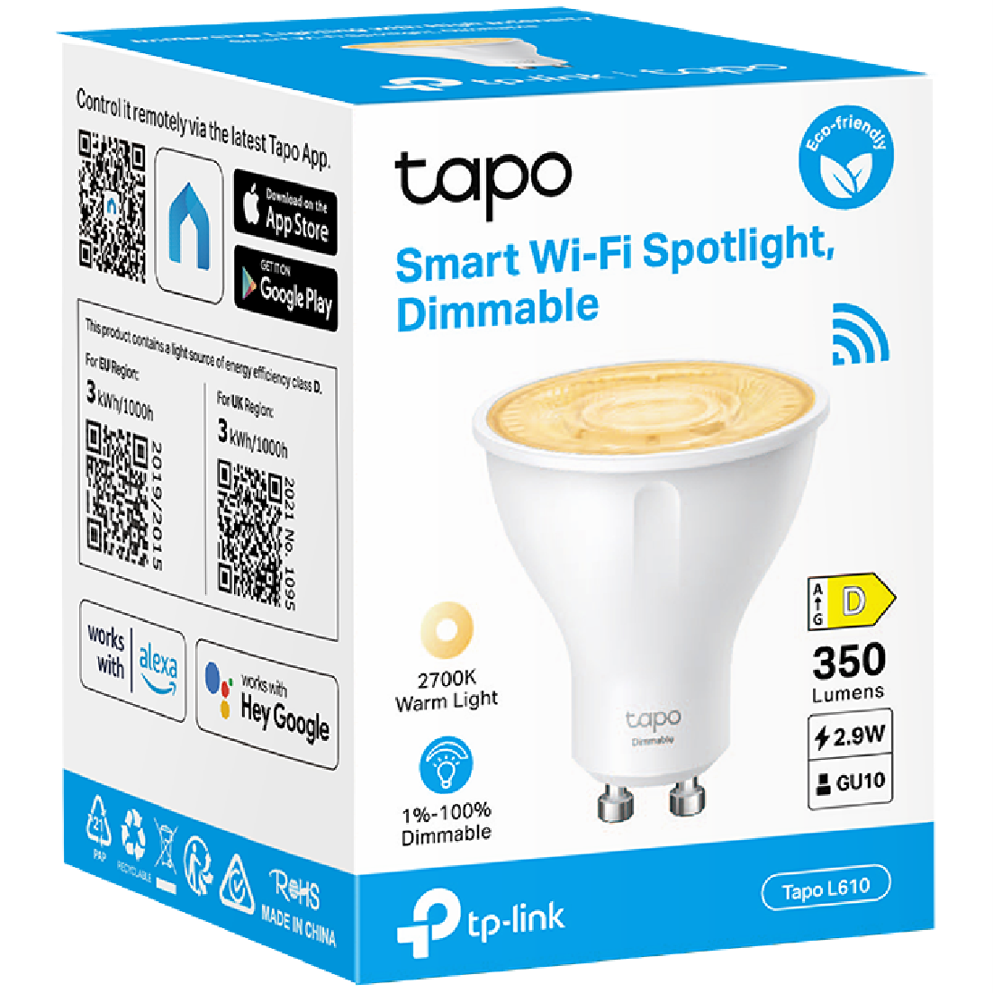 Illuminate your home with smart energy-efficient lighting. The TP-LINK Tapo GU10 White Smart Downlight brings voice-activated convenience to any room. Just pair this downlight with your Alexa or Google Home device to enjoy hands-free voice control. Adjust brightness set schedules and create scenes to customize your lighting experience. The compact GU10 bulb shape installs easily into existing fixtures. It shines at 350 lumens while only using 2.9W of power. Tapo smart bulbs last up to 15000 hours for long-lasting performance. Control your lights whether you're home or away with the intuitive Tapo app. This downlight connects directly to Wi-Fi without a hub required. The 55.2mm wide by 50mm deep dimensions fit most recessed fixtures. Experience the simplicity of smart lighting with this Alexa and Google Assistant compatible downlight. With a 2 year warranty it's a bright choice for energy savings and convenience. The manufacturer's part number for this product is TAPO-L610. Check out the TP-LINK Tapo GU10 White Smart Downlight to upgrade your home with smart lighting today.