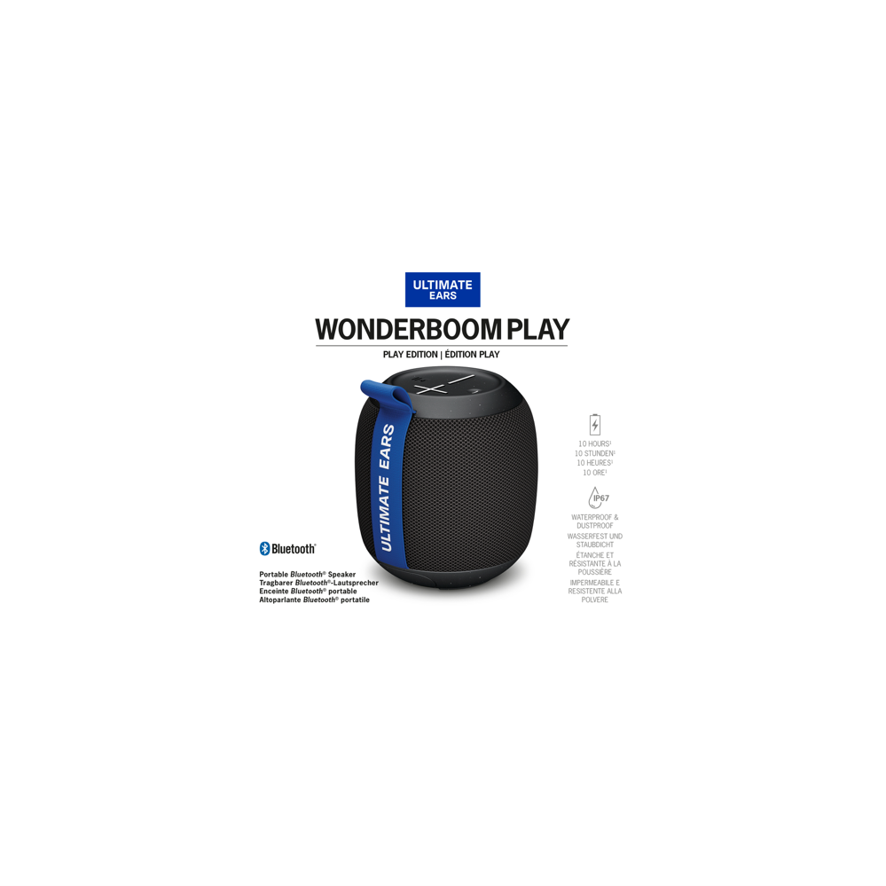 Ready to take your tunes on the go? Meet the Ultimate Ears Wonderboom Play portable Bluetooth speaker in sleek black. With a wireless range of up to 40 metres you can keep the music flowing from across the room or out in the yard. The rechargeable lithium-ion battery delivers up to 10 hours of playtime on a single charge so you can keep the party going all day long. And don't worry about a little rain or sand - the IP67 rating means it's both water and dustproof. Weighing just 0.318 kg it's easy to grab and go. Plus you can connect up to two source devices at the same time for seamless audio switching. Get your groove on with the Wonderboom Play (6234150).