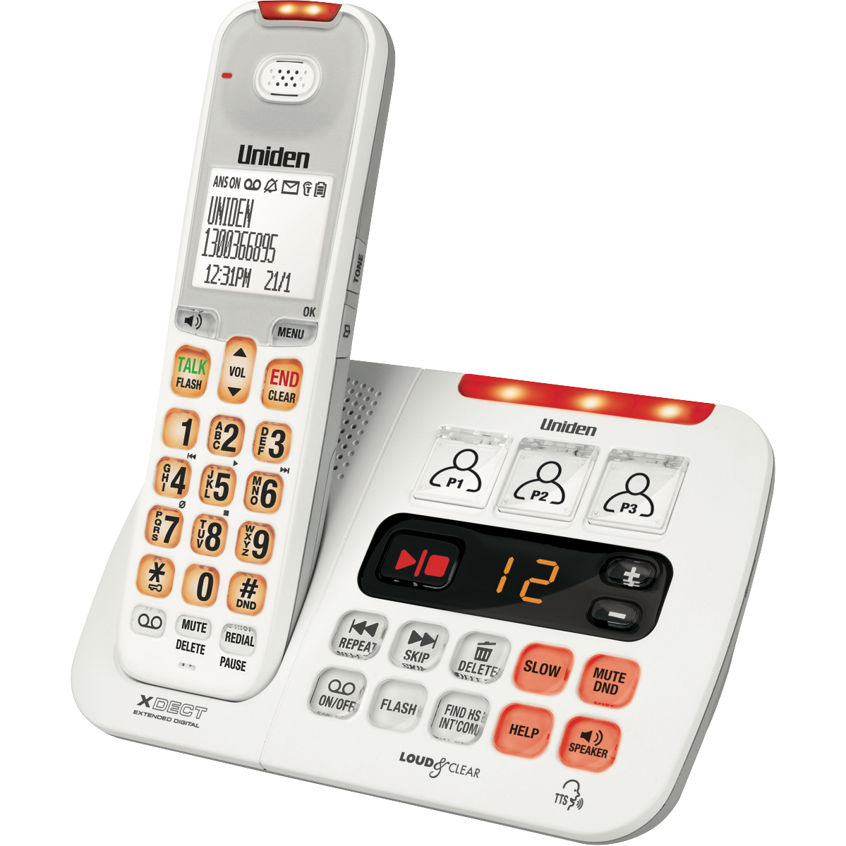 Stay connected with crystal clear call quality using the Uniden SSE45W cordless phone. With a generous 200 phonebook entries to store all your contacts you'll never miss an important call again. Enjoy long 10 hour talk time and up to 7 days standby on a single charge. The handy base even includes an integrated digital answering machine ensuring you'll never miss an important message when you're away. With conveniences like speakerphone caller ID handset conferencing and helpful call block features this phone has everything you need. The intuitive interface allows you to easily access contacts block nuisance calls and even set up 3 dedicated photo speed dials for your most frequent contacts. Designed with 3 full-duplex handsets it enables effortless communication between multiple people at once. Visually appealing with its sleek and compact 180mm x 180mm x 130mm modern design this cordless phone looks great in any home or office. Uniden provides a 1 year warranty for added peace of mind. The manufacturer's part number for this product is SSE45W. Give your home or office the gift of seamless uninterrupted communication with the Uniden SSE45W.