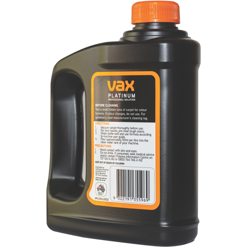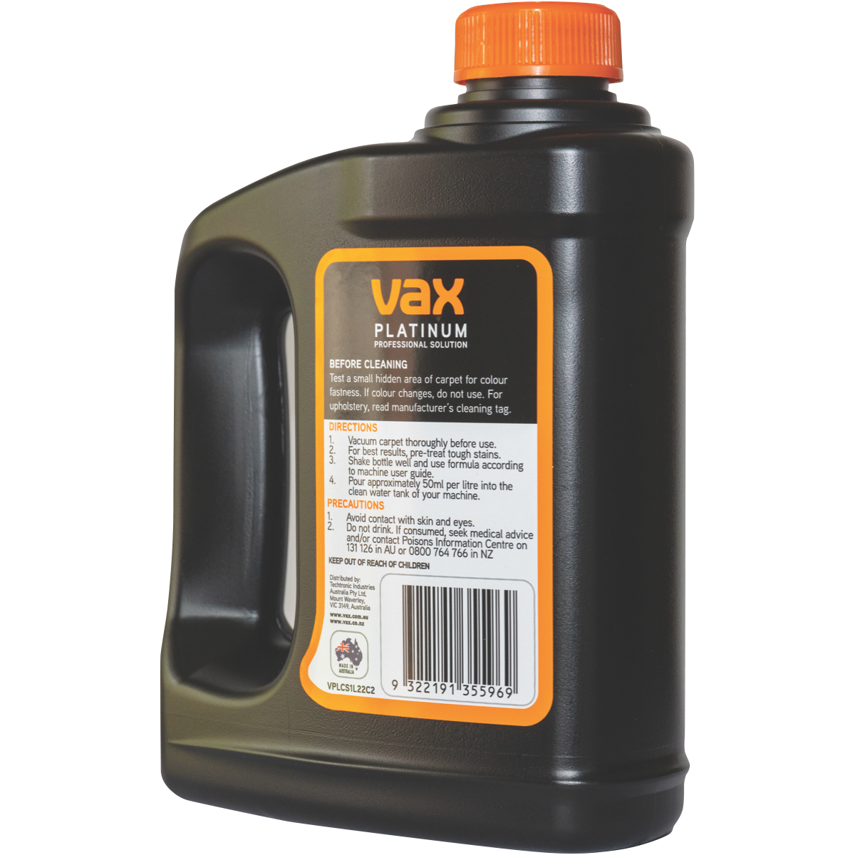 Eliminate stubborn carpet stains with the powerful Vax Platinum Carpet Solution. This advanced formula tackles even the toughest stains like red wine coffee and grease leaving your carpets looking clean and fresh. The active cleaning agents penetrate deep into carpet fibers lifting away dirt debris and stains with ease. Suitable for use with Vax's VX97 and VX100 carpet cleaning machines this versatile cleaner is safe for all carpet types. The 1 litre bottle provides enough solution to tackle multiple rooms so you can give your whole home a deep clean. Simply fill the cleaning machine apply the solution and watch as it goes to work dissolving stains.With Vax's Platinum Carpet Solution you can finally say goodbye to unsightly marks and revive the look of your carpets. Your floors will be revived and restored to their original beauty. Give your carpets the care they deserve with this hardworking stain remover.The manufacturer's part number for this product is VPLCS1L22C2. Revitalise your carpets today with the Vax Platinum Carpet Solution.
