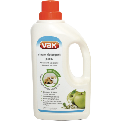 Vax Solution Pet 1LT is a steam cleaning detergent for Vax steam and detergent machines. It attacks unwanted grease and grime and eliminates 99.9% of harmful bacteria. It neutralises odour and leaves an Apple Blossom fragrance for clean carpet that smells fresh. It s active for up to seven days and is 100% non-toxic and biodegradable so it s pet child and eco-friendly.