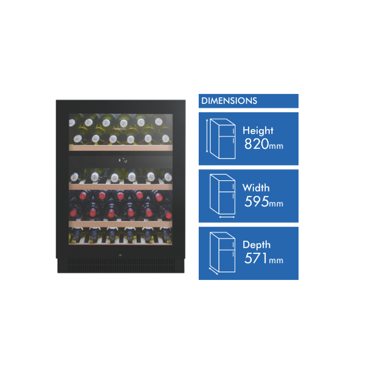 Additional Features Dual Temperature Zones, Stable Temperature, Two Separate Zones, UV Protected Dark Storage Area, Borderless Black Glass Finish, Zone 1 from 6-12 Degrees C, Zone 2 from 12-18 Degrees C, Triple Glazed %26amp; UV Treated Door, Recessed Handle, LED Digital Display