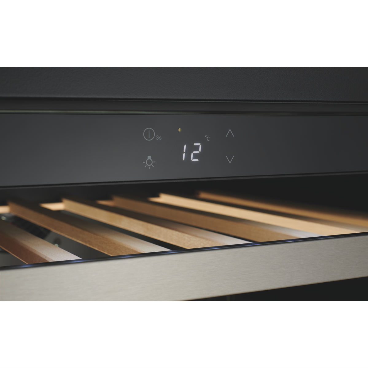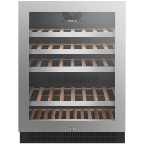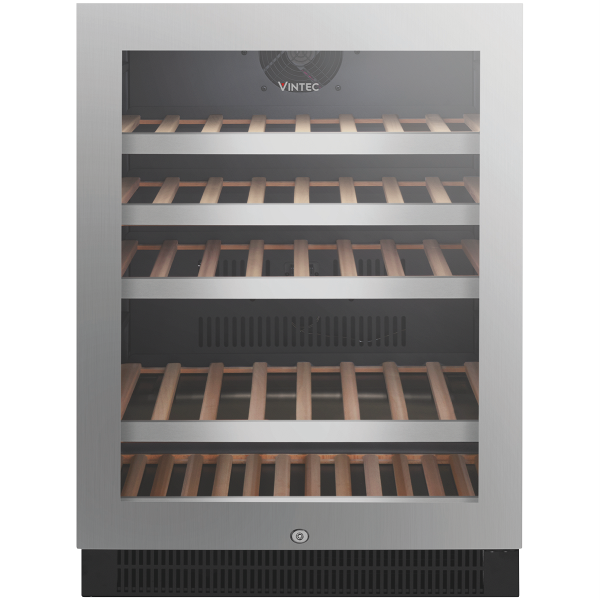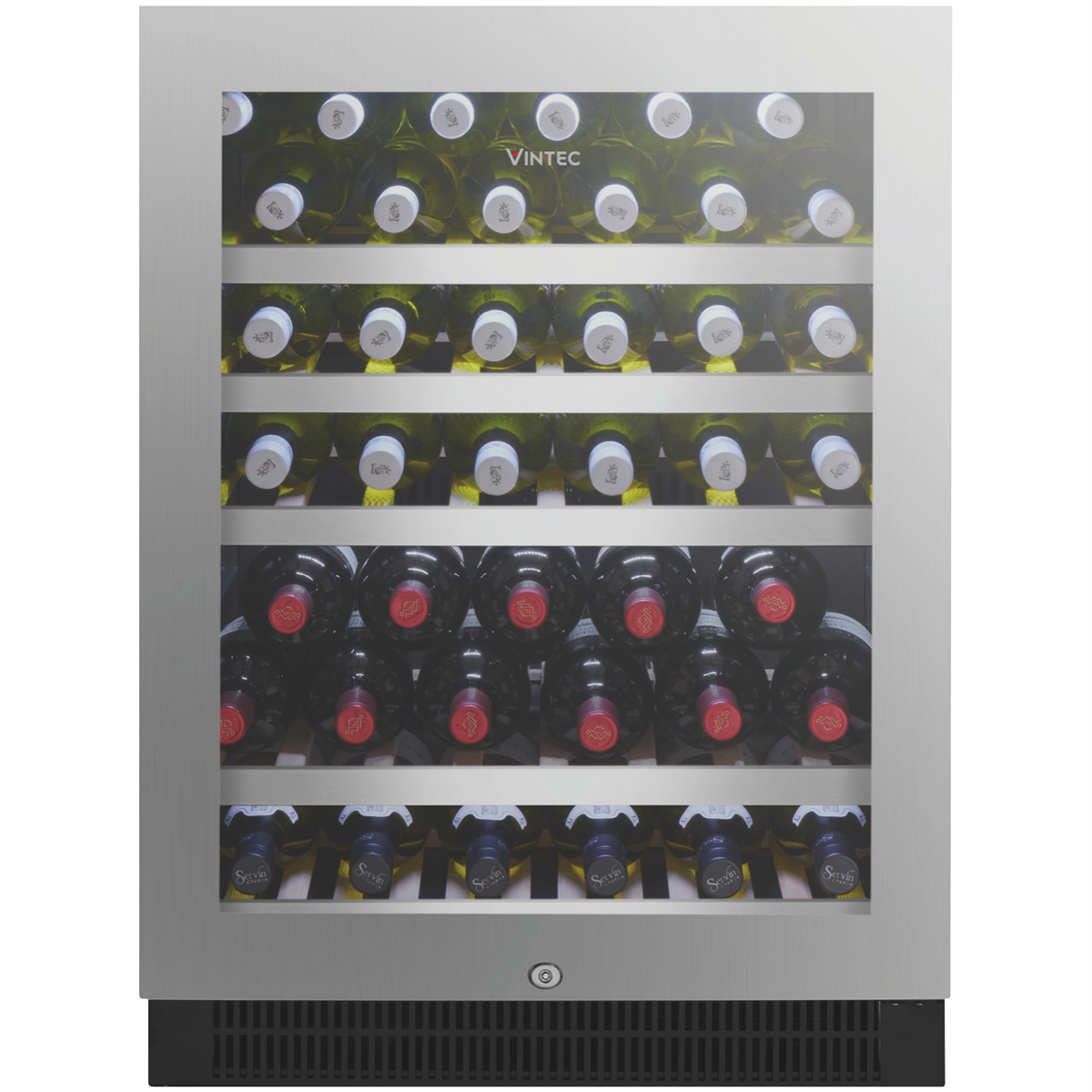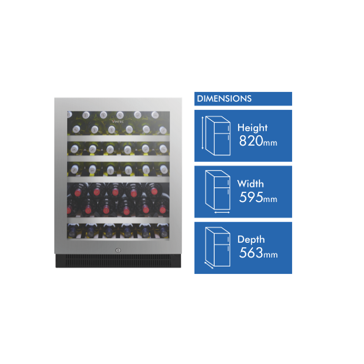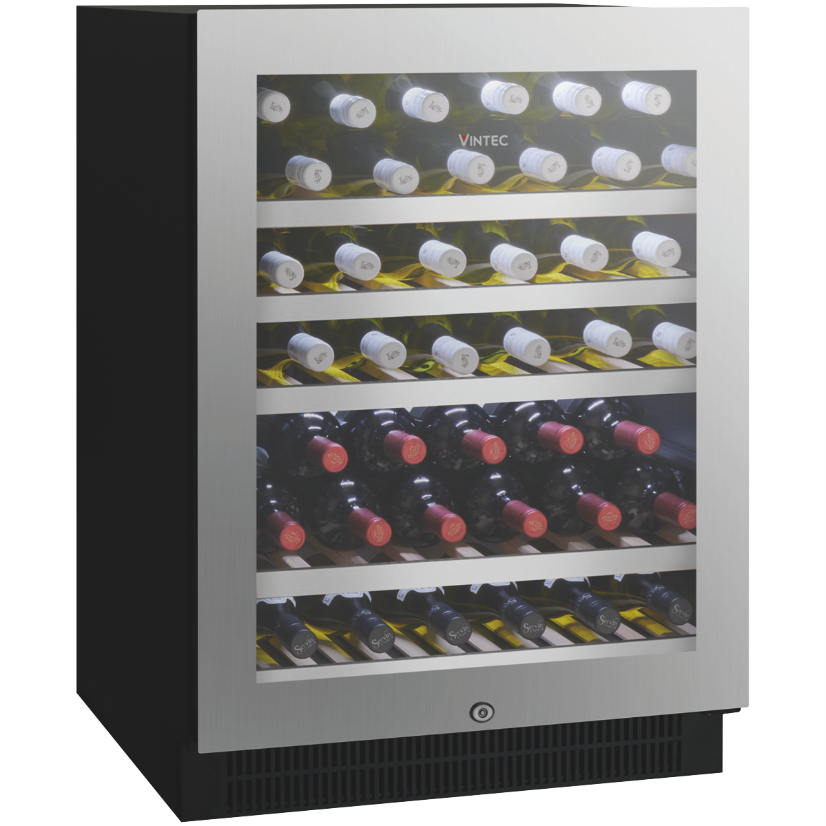 The stylish Vintec 50 Bottle Wine Cabinet offers a sophisticated way to store your fine wines while keeping them at optimal temperature. With its dual hinged reversible door stainless steel finish and capacity for 50 of your favorite bottles this wine fridge adds a touch of elegance to any room. The temperature can be easily controlled to keep both reds and whites at just the right chill. Designed to match the Vintec VBS050SSB this freestanding wine cabinet features adjustable shelving an internal light and a sleek silver exterior. Measuring 595mm wide 820mm high and 571mm deep it has a compact footprint that fits well in tight spaces. Show off your best vintages or build a collection over time with this versatile wine cooler. The manufacturer's part number for this product is VWS050SSB-X. See how the Vintec 50 Bottle Wine Cabinet can provide convenient wine storage and display for your home today.
