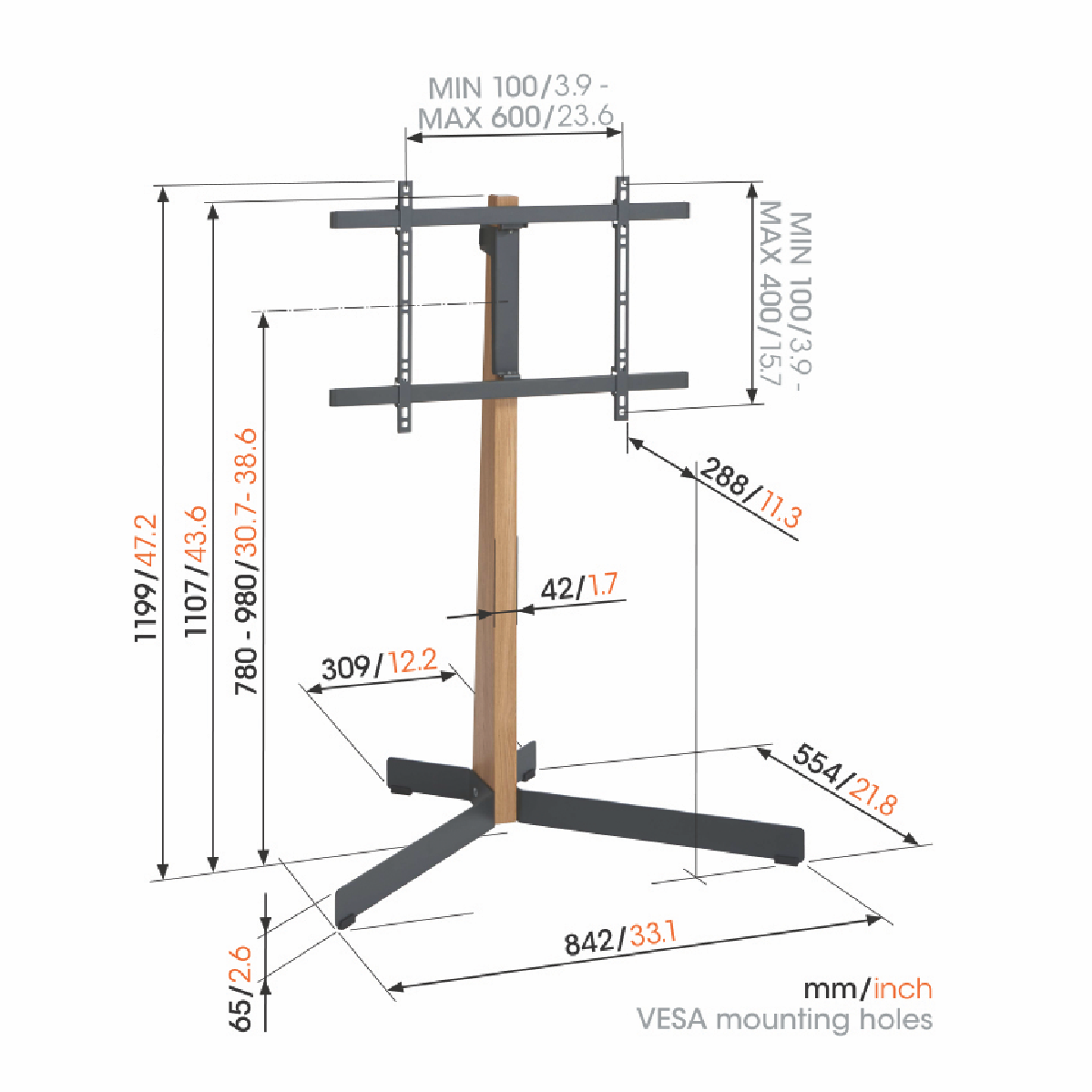 Enhance your home entertainment setup with the sleek and sturdy Vogels TV Floor Stand. This tilt stand provides a stable base for TVs from 40 to 77 inches supporting up to 50kg for long-lasting durability. With its modern black and oak design the floor stand complements any living room decor while keeping screens at an optimal viewing angle. Tilt your TV up to 15 degrees to reduce glare and adjust the height between 117cm and 200cm to customize your viewing experience. The heavy-duty steel construction and maximum 600 x 400mm VESA pattern ensure compatibility with a wide range of flat panel TVs. Give your binge-watching marathons gaming sessions and movie nights a boost with this high-quality TV floor stand that brings screens to eye level. Vogels provides a 10 year warranty for added peace of mind. The manufacturer's part number for this product is TVS3695B. Consider the Vogels TV Floor Stand to lift your TV viewing to new heights!